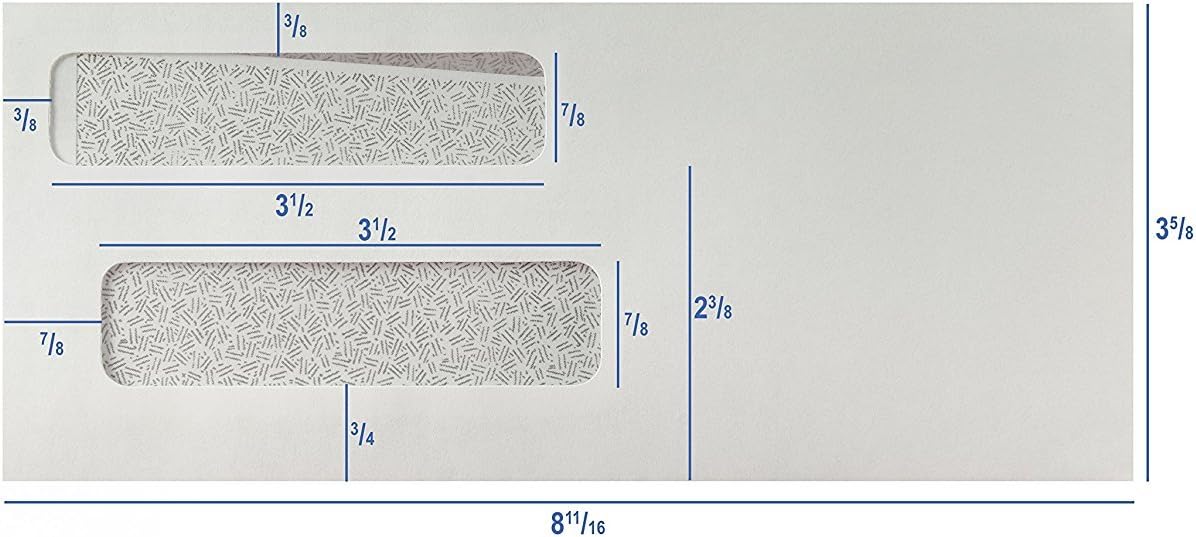- The bottom window location 3/4'' from the bottom and a 7/8'' window height prevent check amounts from showing in the bottom window like other check envelopes.