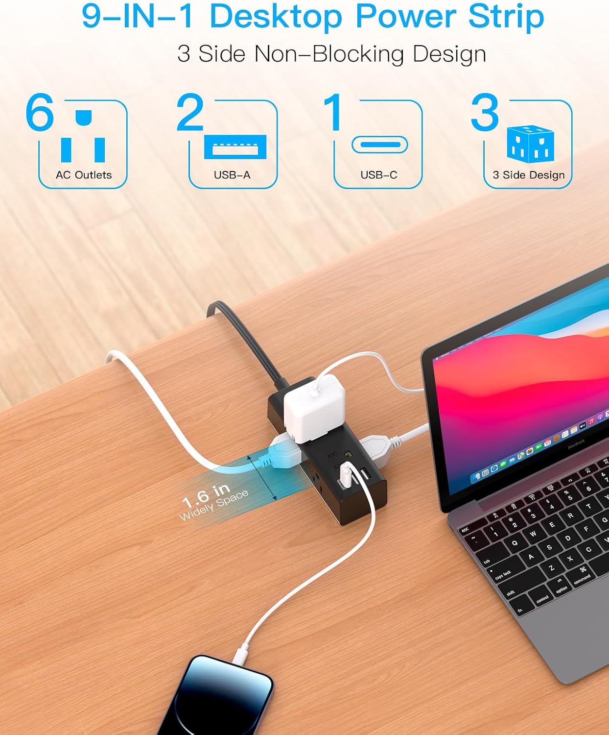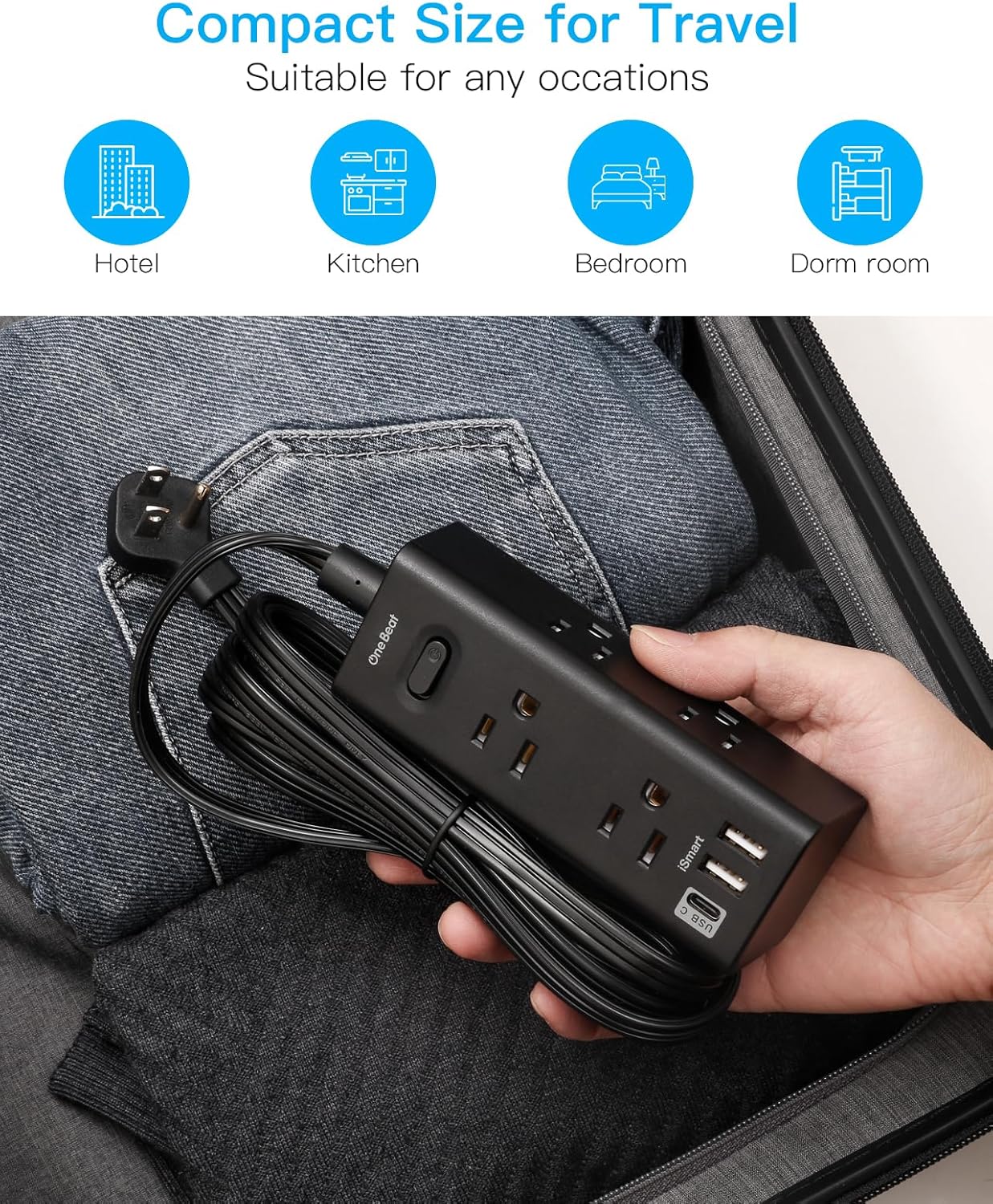【9-in-1 Extension Cord with Multiple Outlets】The flat power strip can turn 1 socket into 6 AC outlets, 2 USB-A and 1 USB-C, which can charge up to 9 devices at the same time. The USB C port can charge up to 5V/3A. 2 USB-A ports can charge up to 5V/2.4A max. The output of all USB ports is 5V/4.5A, compatible with your mobile phone, laptop, tablet, headphones or cameras without a variety of converters.