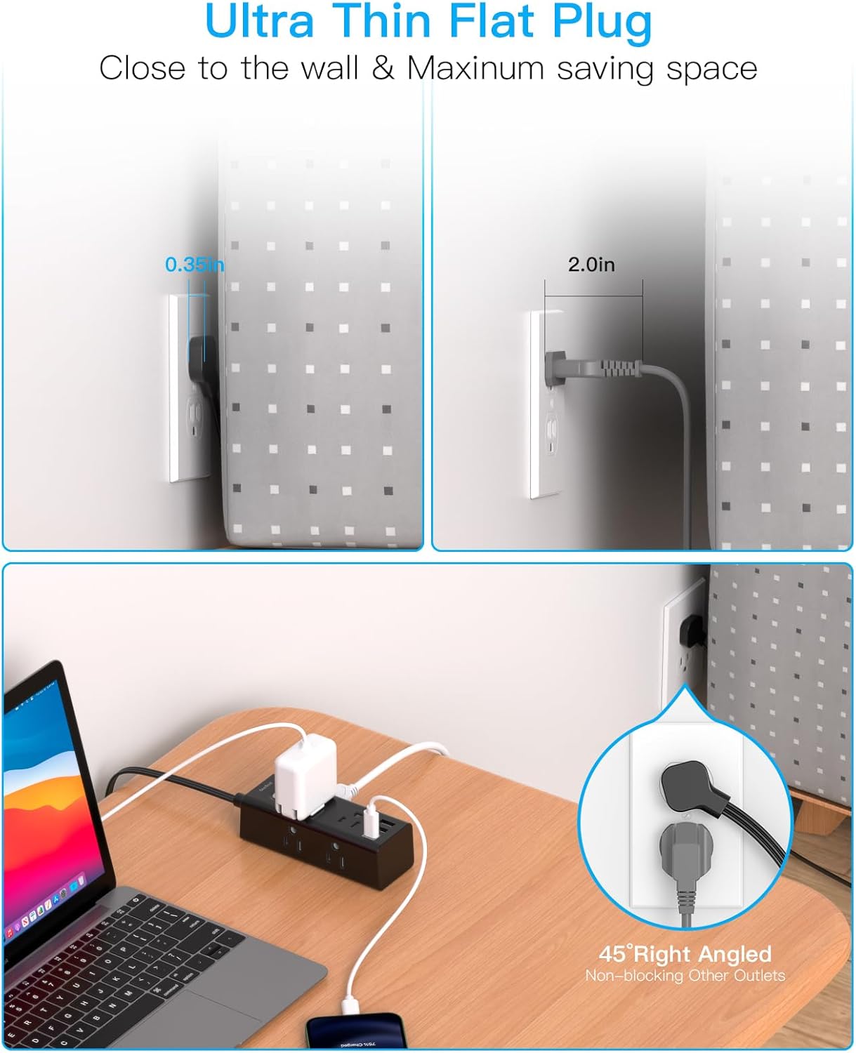 【Flat Wall Adapter & Desktop Power Strip with USB Ports】Two mounting holes on the back allow this power strip to be securely installed in various applications, saves space and makes your desk organized.