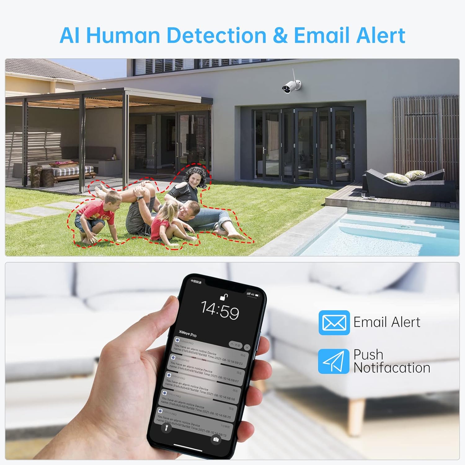 Remote Access Anytime Anywhere & AI Human Detection: SMONET outdoor security cameras with wireless wifi support video preview, recording, synchronous playback, backup, AI human detection and email alarm. You can get remote access on smart devices (IOS/Android) anytime and anywhere with smartphone, tablet and PC. You will never miss a moment. AI human detection provides a way to minimize false alarms. You can set up a monitoring area, an email alert or APP alert will be sent once motion is detected.