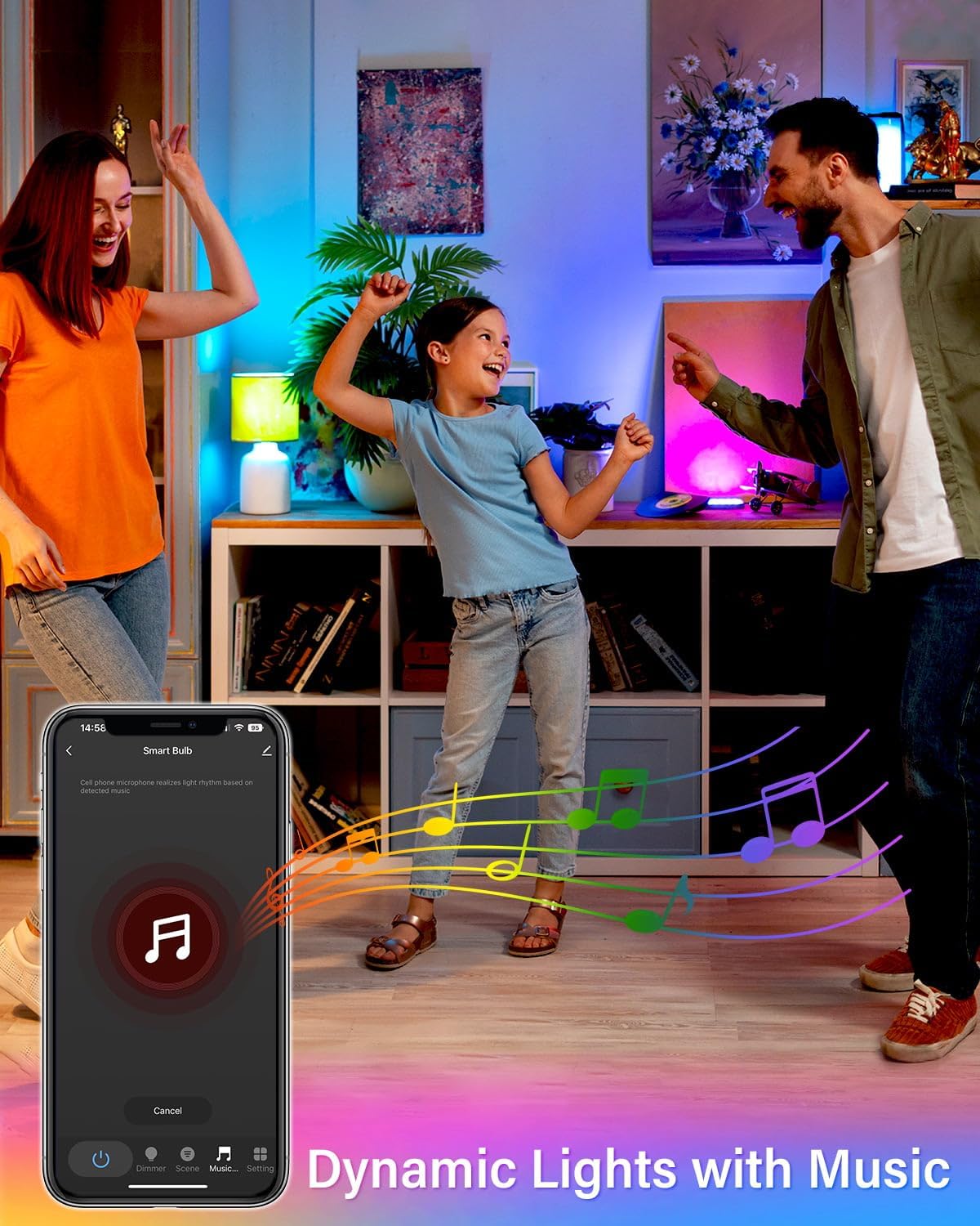 Musical synchronization for the immersive environment: Enjoy the dynamic lighting that is synchronized with your favorite music. Perfect for parties, game nights or humor lighting: E12 smart bulb colors change with real -time rhythm through the Smart Life application.