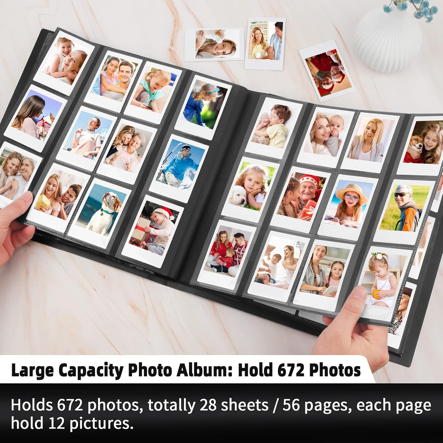 Great capacity: stores 672 photos contain 560 films in total, for mini photo album it contains 56 individual pages with 12 photos per page, it opens as a book for easy visualization. An excellent way to maintain its precious organized collection and in excellent condition.