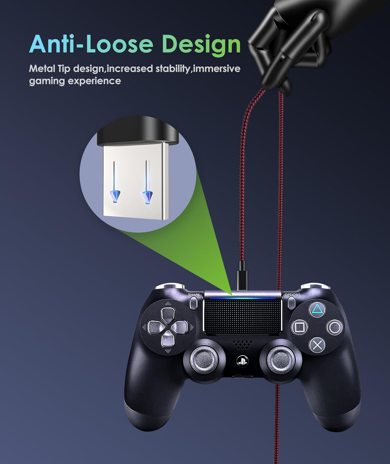 Designed for PS4 Gaming: 10ft Micro USB charger cable specially designed for PS4 controller. One of the first charging cables made with bulletproof Aramid fiber, tangle-free triple braided nylon exterior and laser welded aluminum connectors make this cable stand out from other common USB cables as it withstands at least 10,000 times 90 degree bend test