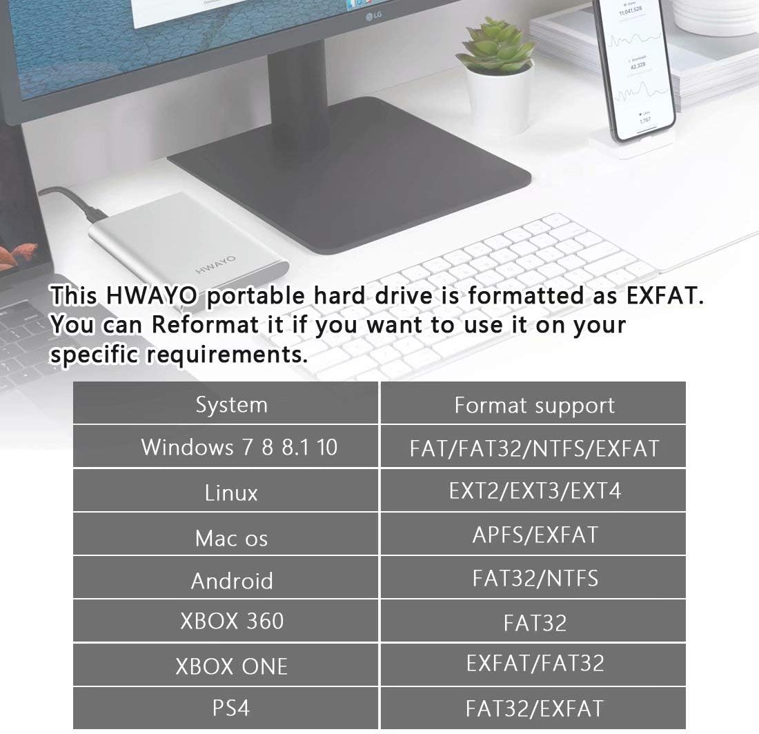 7. By default, this Hwayo portable hard drive is formatted as exfat. You can reformat it if you want to use it in your specific requirements.