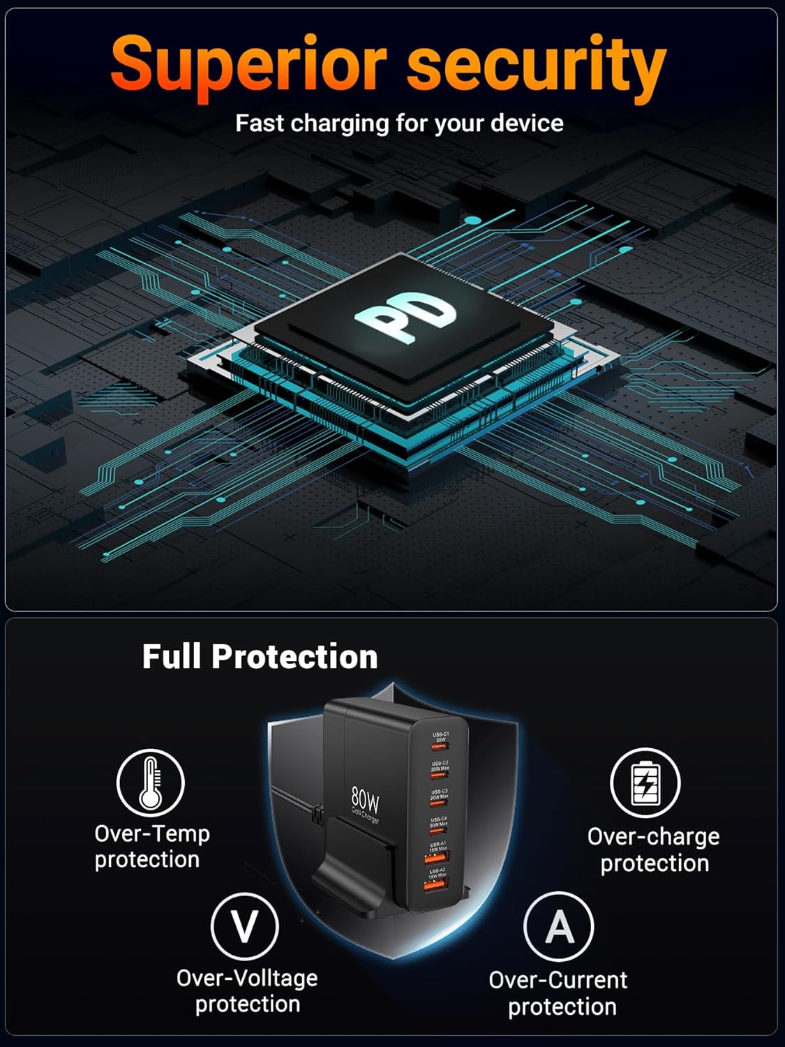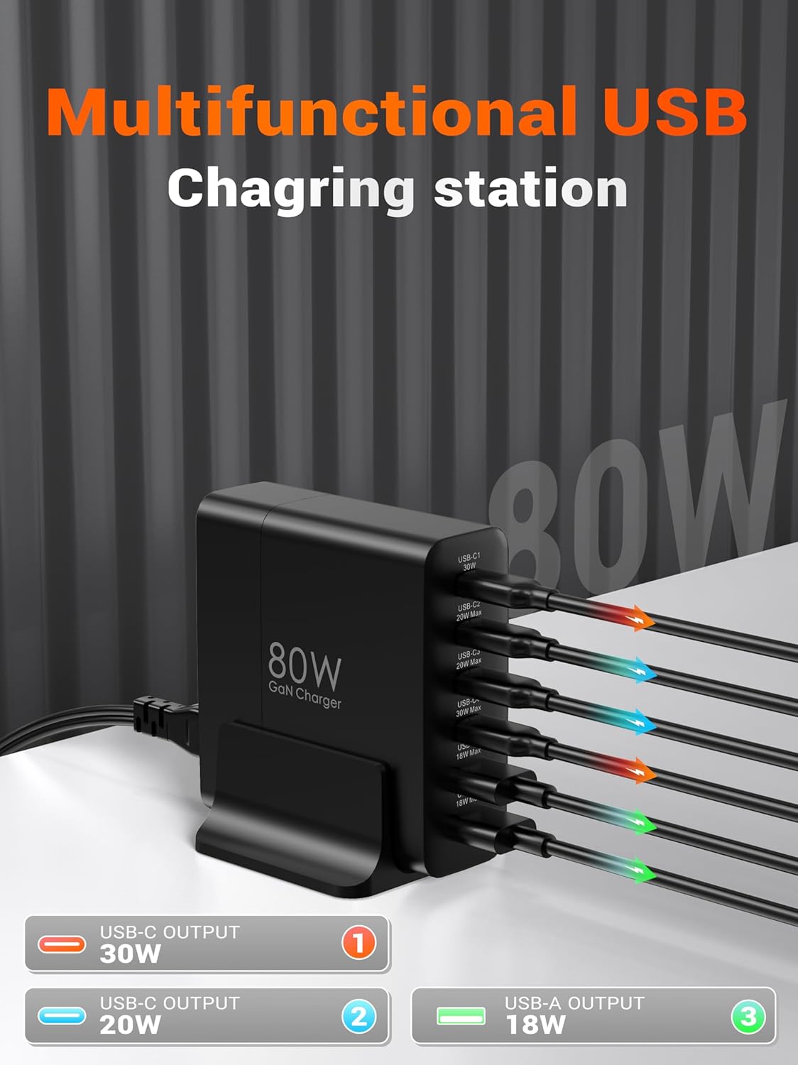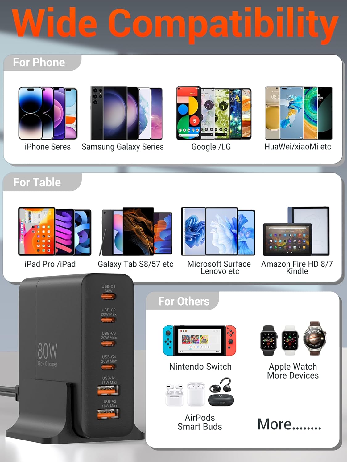 【80W Charging Station】This USB-C charger supports PD3.0, PPS, QC3.0, 2.4A, AFC, FCP and other fast charging protocols, covering almost all smartphones and other electronic devices on the market. market. The maximum output of a single port is 45W and the total output power is 80W. It only takes 30 minutes to charge iPhone 15 to 56% and Galaxy S23 to 60%.