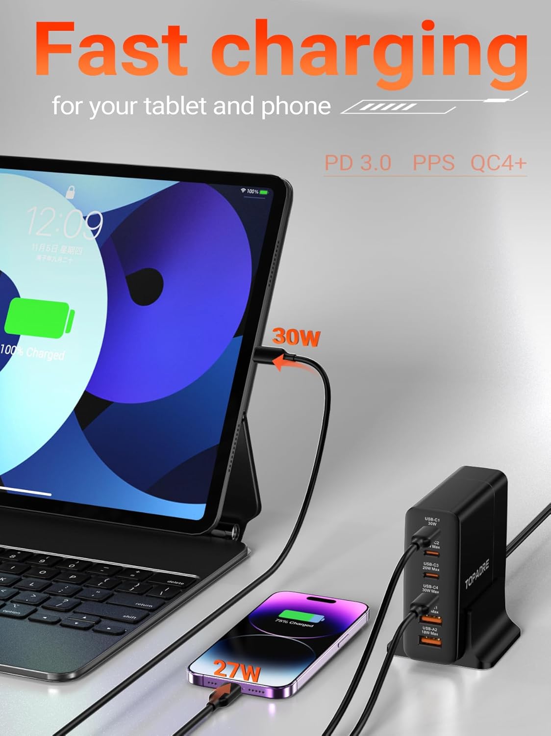 【Brand Service and Commitment】Inside the package, you will discover an 80W charger, a 4.92ft detachable power cable, and a desktop stand. TOPADRE promises a 24-month warranty and is dedicated to serving customers at any time. If you have any problems, please feel free to contact us and we will reply to you within 24 hours.