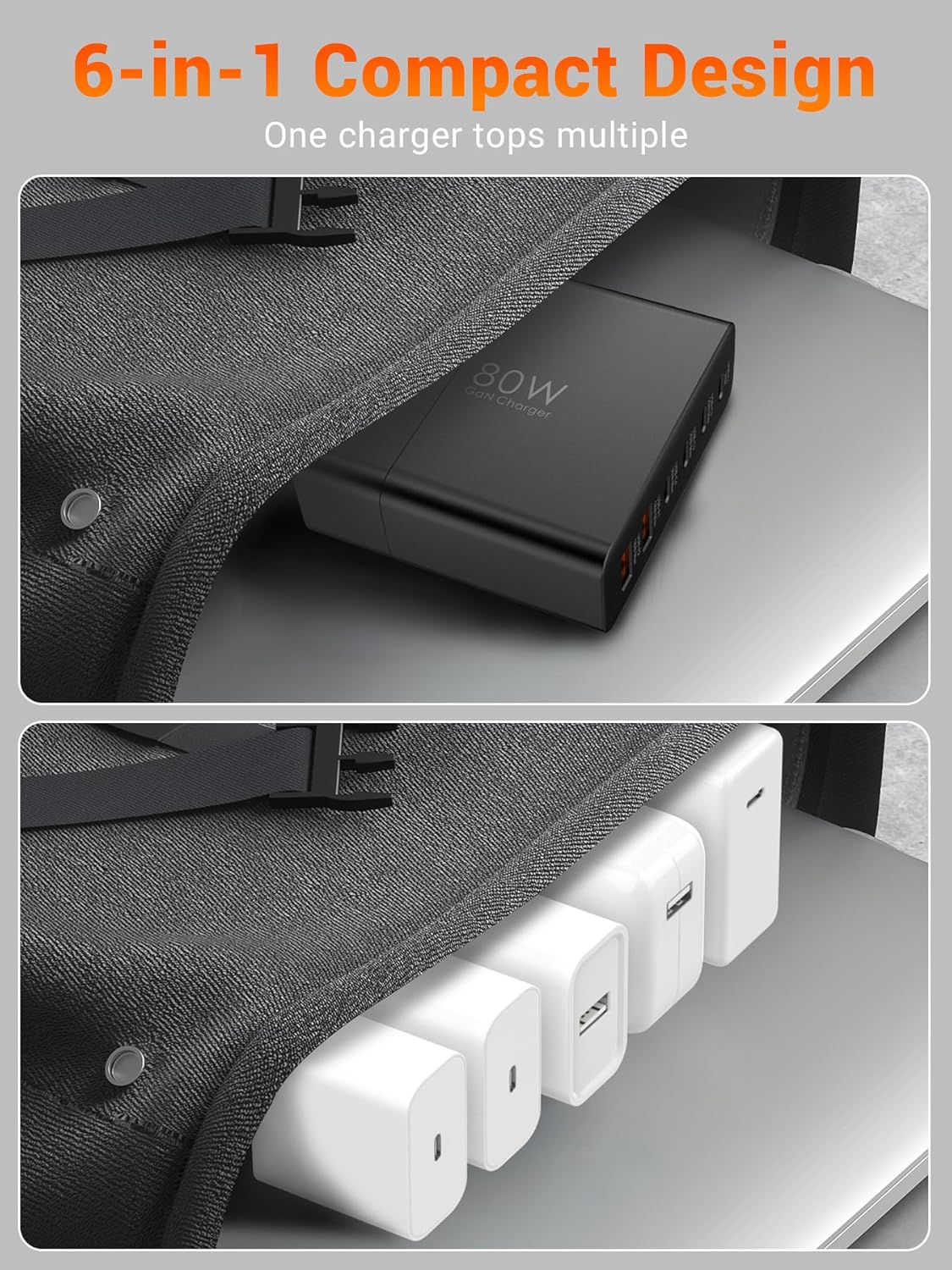 【6 in 1 USB-C Charger】This fast charging brick is equipped with 4 USB-C ports (45W) and 2 USB-A ports (20W), capable of powering up to 6 devices simultaneously. Compact but powerful, it is convenient to carry, not only reduces the burden of accessories during business trips or travel, but also helps you create a neat and organized desk in your bedroom.