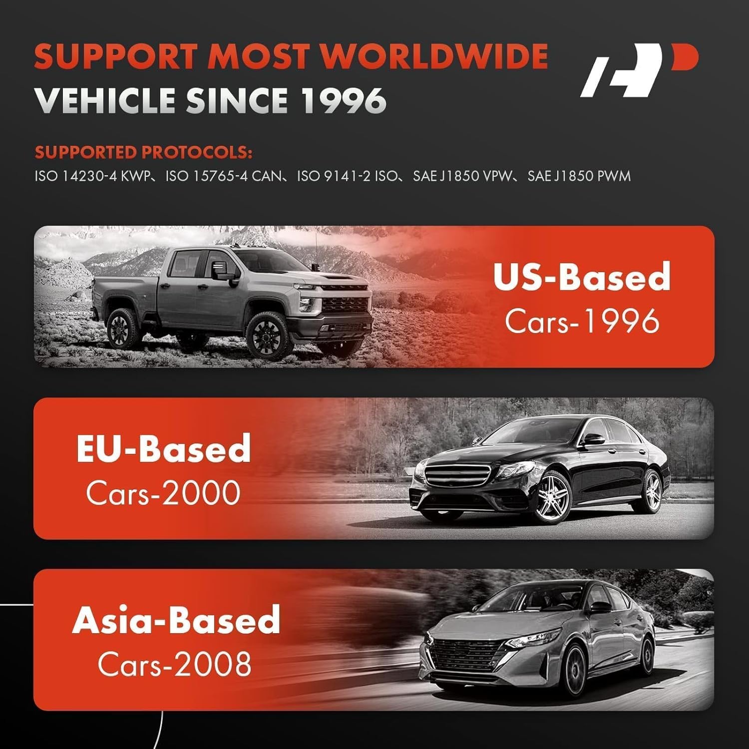 [Wide Fitment & OBD Protocols]: This automobile diagnostic scanner is widely suitable for several models, such as: Caros from North America of 1996-2024, 2000-2024 Europe Cars, 2008-2024 Asia Auth (such as Japan or Korea brands), but also includes 12v trucks, SUV, MPV, sedan, etc., even if you have multiple cars of different brands or year, you can easily adapt. Compatible OBD protocols: KWP2000, 15765-4 CAN, ISO9141-2, J1850 VPW, SAE J1850 PWM, are easily in Ford, Chevy, GM, Toyota, Honda, Dodge, Dodge and other vehicles
