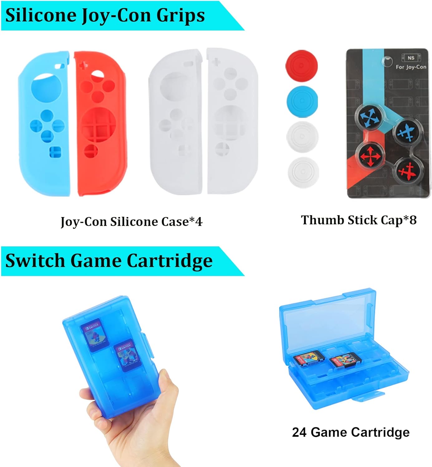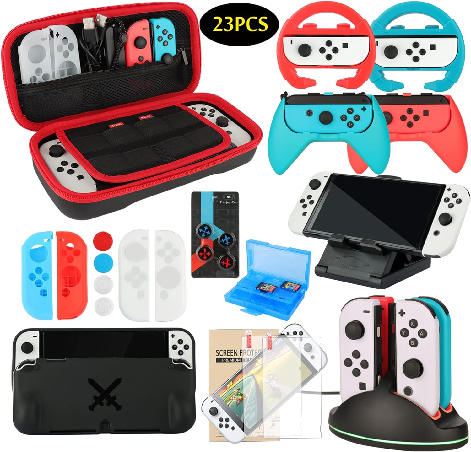 23 in 1 Complete Kit: Accessory kit includes: 2 * steering wheels, 4 * silicone covers for joy-con, 8 * thumb caps for joy-con, 2 * grips for joy-con, 1 * hard carrying case , 2 * tempered glass screen protectors, 1 * game cartridge, 1 * TPU soft case for switch, 1 * charging dock for joy con and 1 * adjustable game stand.
