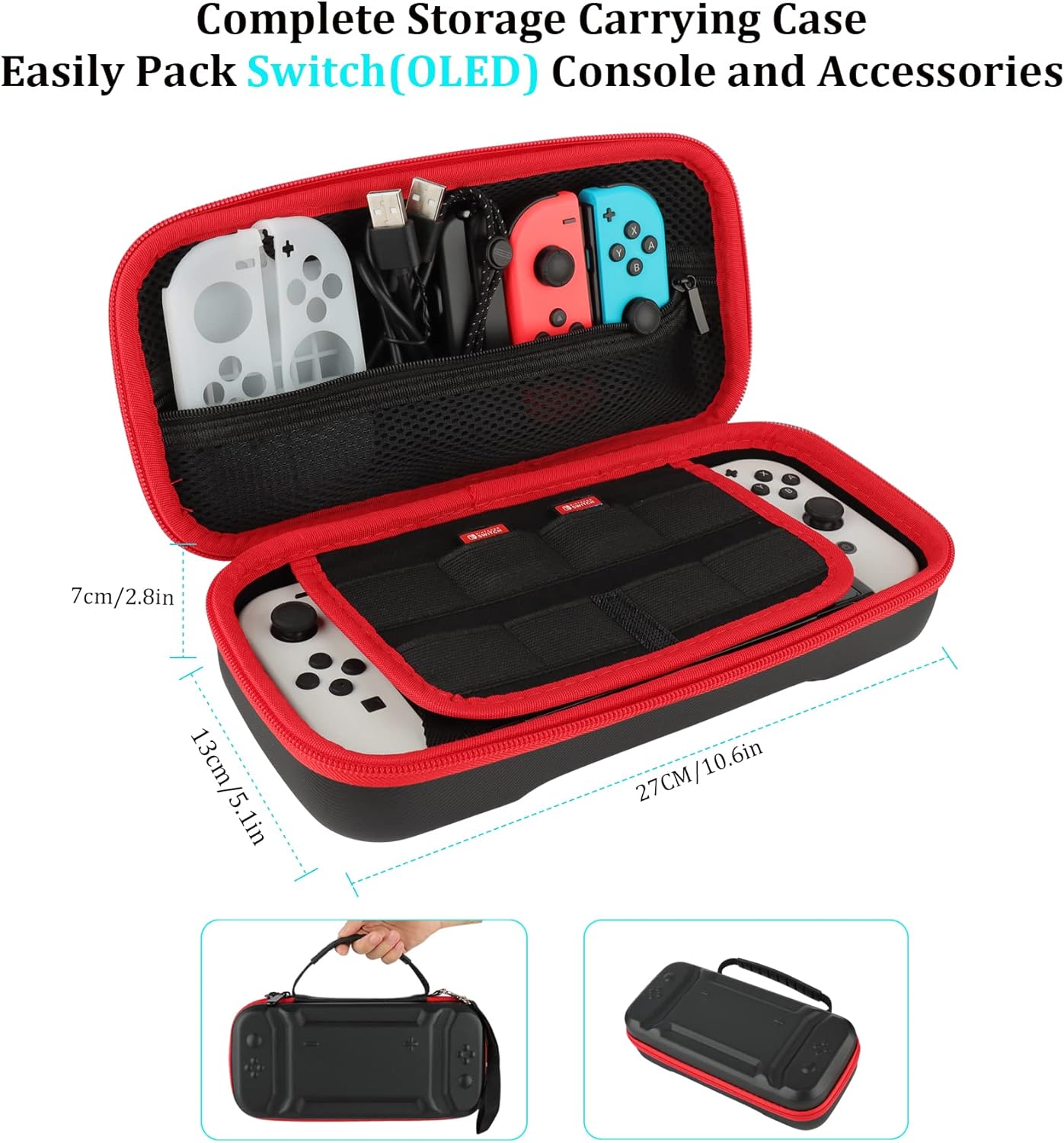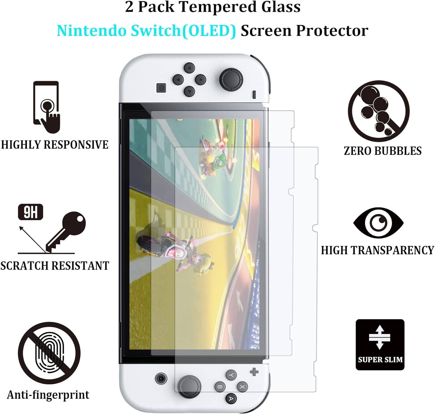 Convenient and affordable package: This complete accessory package can save you money and time when choosing multiple accessories. ONLY compatible with the Nintendo Switch OLED model (2021). 23 in 1 Complete Kit: Accessory kit includes: 2 * steering wheels, 4 * silicone covers for joy-con, 8 * thumb caps for joy-con, 2 * grips for joy-con, 1 * hard carrying case , 2 * tempered glass screen protectors, 1 * game cartridge, 1 * TPU soft case for switch, 1 * charging dock for joy con and 1 * adjustable game stand.