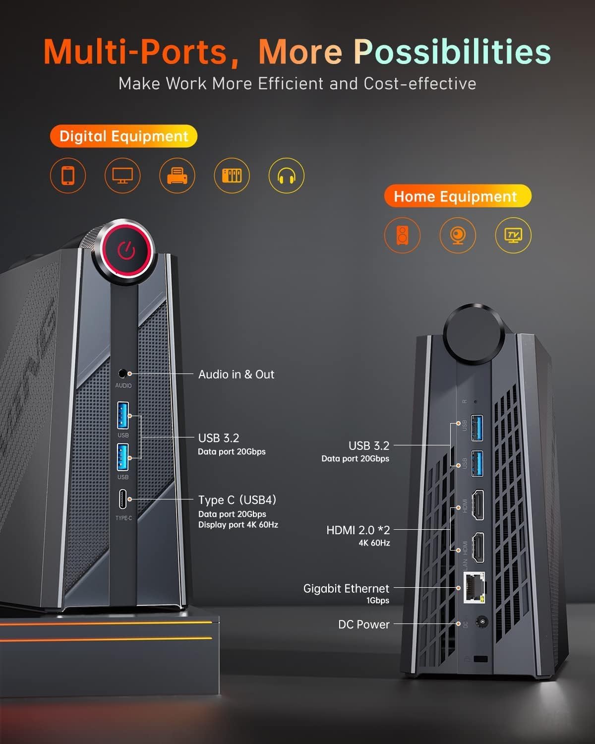 【Stable Connection & Wireless Convenience】Stay connected with the latest WiFi 6 technology, delivering speeds of up to 9.6Gbps. Take your mini PC anywhere wirelessly with built-in WiFi 6. The RJ45 interface supports 1000Mbps for efficient streaming and download speeds. Bluetooth 5.2 ensures fast recognition of your accessories and provides a stable and secure wireless connection for a clutter-free desktop experience.