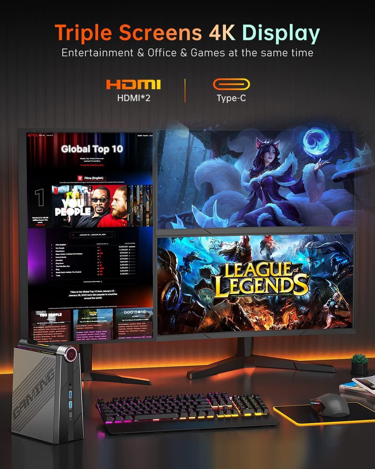 【Multitasking with Triple Monitors】Boost your productivity with the mini desktop PC. Connect up to three monitors with the two HDMI 2.0 ports and one Type-C port, supporting 4k resolution at 60Hz. Multitask efficiently, save time, and improve your work efficiency with this powerful mini computer. Enhance your workspace setup with the KAMRUI AM08PRO micro PC