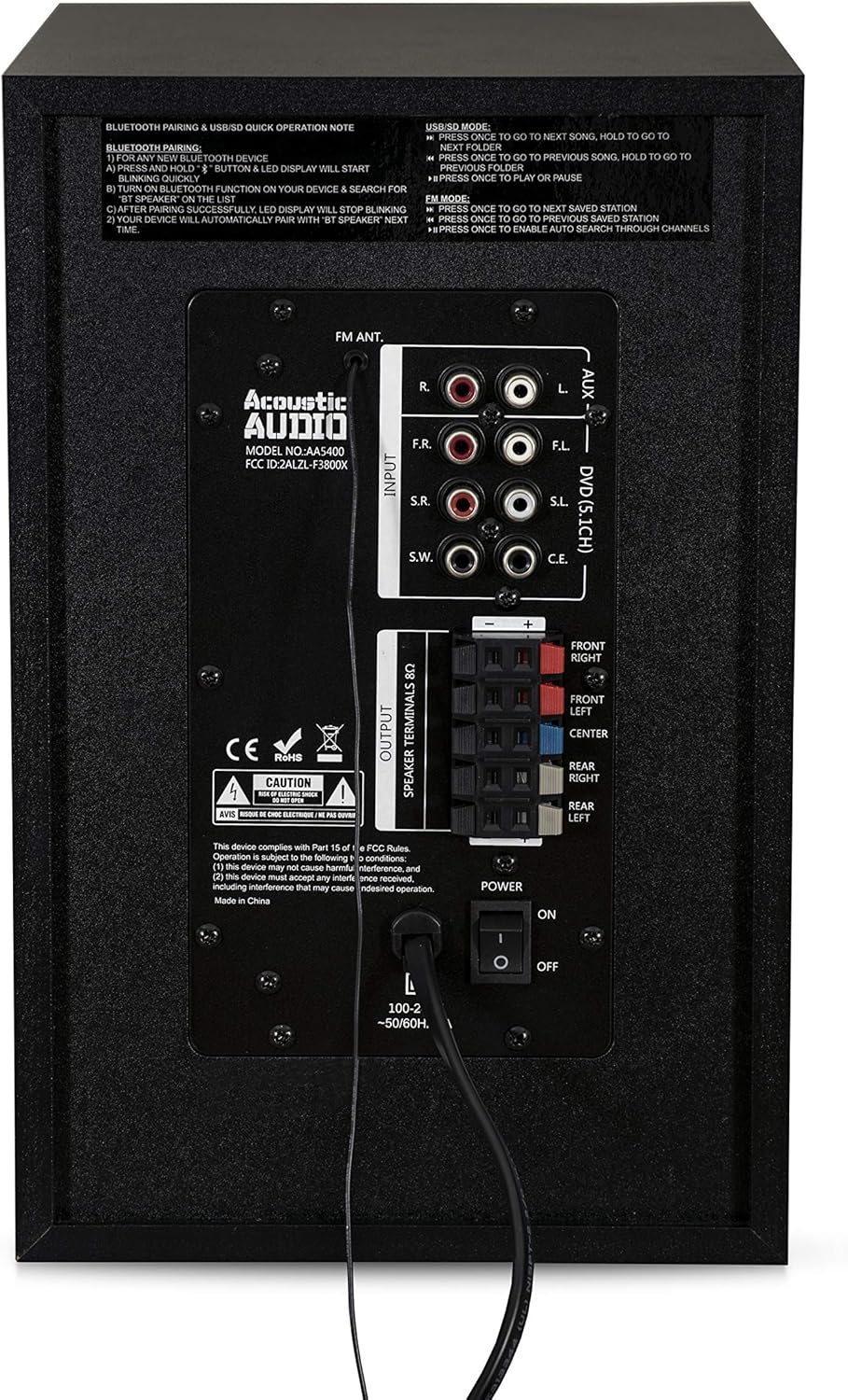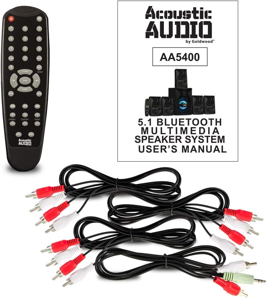 WHAT'S IN THE BOX: Acoustic Audio by Goldwood AA5400 powered subwoofer, 5 wired passive satellite speakers, full-function remote control, 3.5mm to RCA cable, 3 RCA to RCA cables, and an instruction manual.