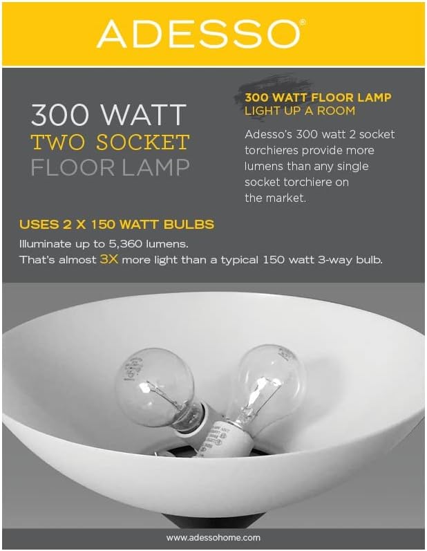 Functional Design: An Adesso patented 300-watt dual-socket construction allows for two criss-cross sockets, each with 150-watt incandescent or LED bulbs on and off, providing approximately 3 times more light than a typical torch. A simple 4-way rotary switch is located on the pole and adjusts the light as follows: overhead light on, reading light on, both lights on and off. This lamp has a black cord and is compatible with a smart outlet. Bulbs are not included.