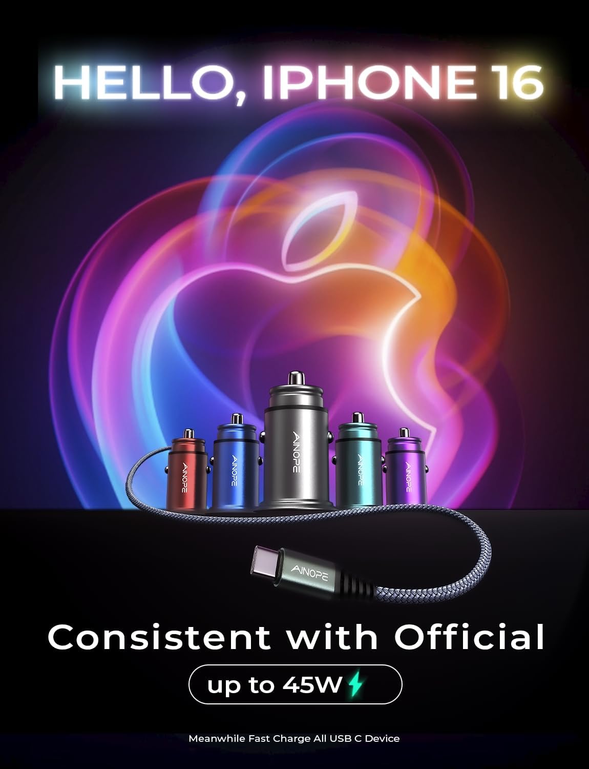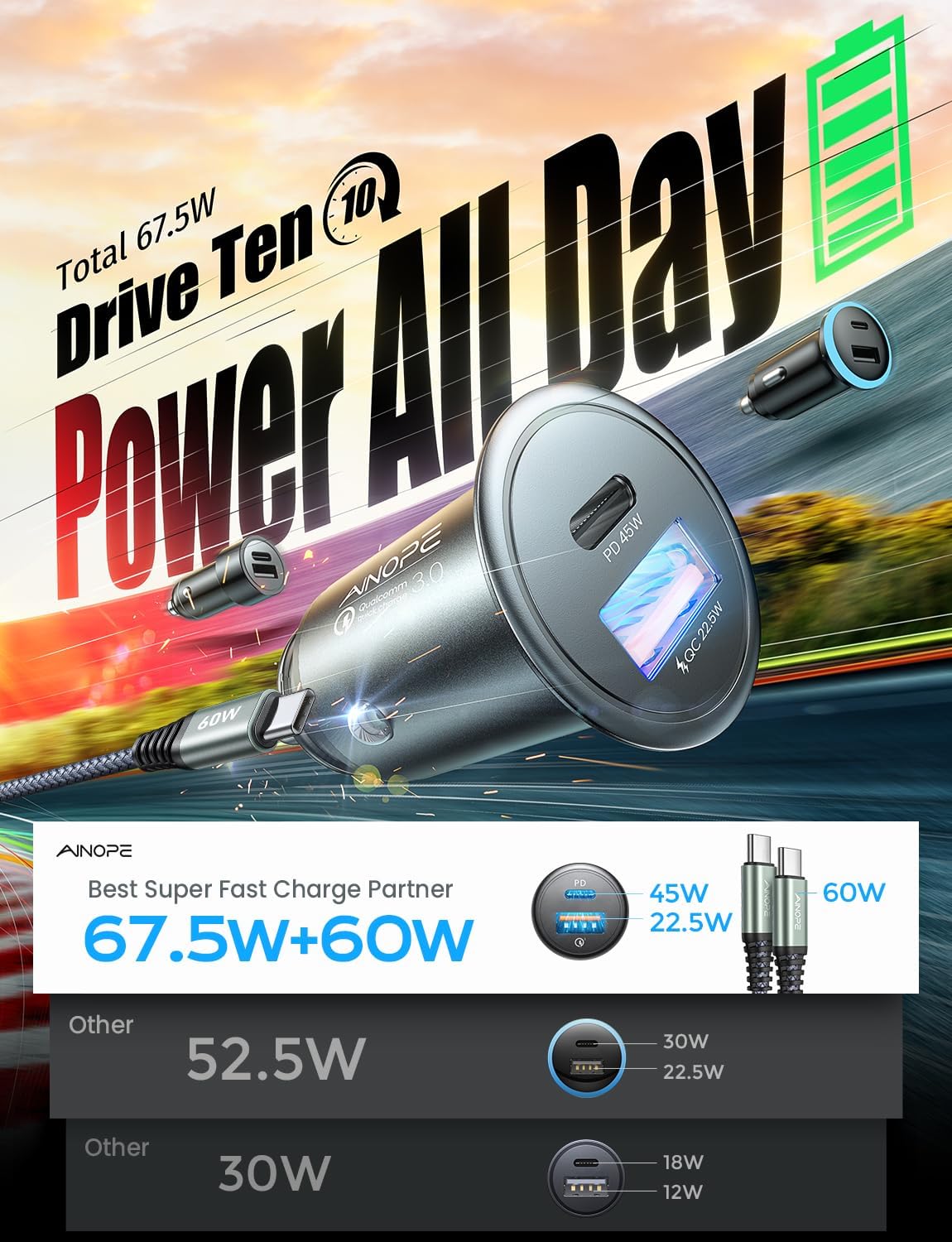 [67.5W EFFICIENT QUICK CHARGING]: AINOPE 67.5W fast charging iPhone 15 car charger provides PD 45W(Max) and QC 22.5W(Max) high output, help you enjoy fast and efficient charging at a maximum output of 67.5W. The 45W PD port, 10X faster than 2.4A charger, can fast charge MacBook, iPad, Samsung Galaxy, iPhone 16 Pro Max, iPhone 15 Pro Max, Google Pixel and more USB C devices. The 22.5W quick charge 3.0 port charges devices from 0% to 80% within 35 minutes. Note: A super-fast charging 60W USB C-C Cable is included.