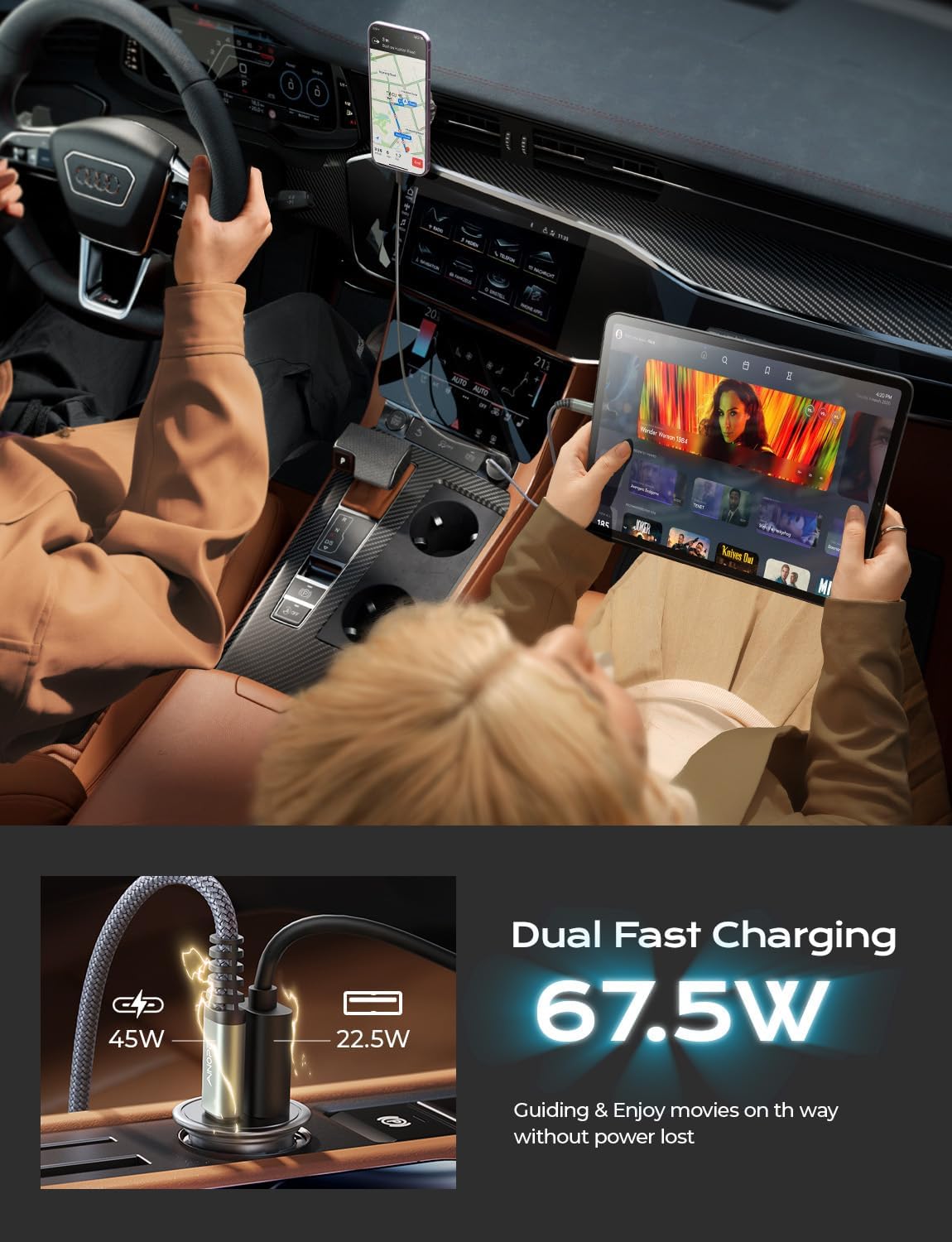 [UNINTERRUPTED FAST CHARGING SIMULTANEOUSLY FOR 2 DEVICES]: Whether you use the 45W USB-C port or a combination of 45W USB-C and 22.5W USB-A port, you can enjoy fast and efficient charging with a maximum output of 67.5W, perfect compatibility with 40W and below products. AINOPE car charger USB C 67.5W has integrated superconductor tech for dual channel fast charging without splitting power, redefine what fast charging is.