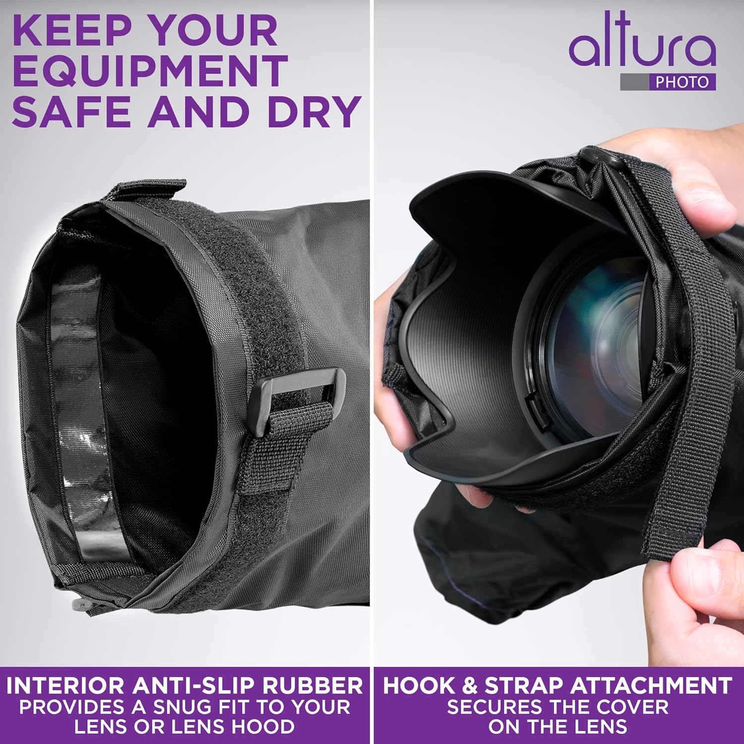 – New integrated hook and loop outer strap and non-slip inner rubber provide a perfect fit to the lens or lens hood.