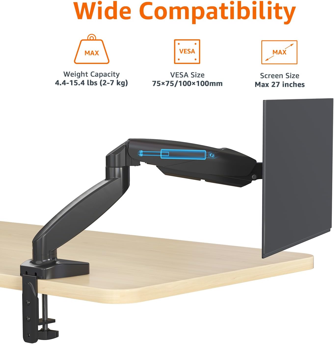 Unique monitor desktop assembly: accommodate LCD LED screens from 15 to 27 inches; Articulate the gas spring monitor arm provides an efficient solution in space for single monitor configurations