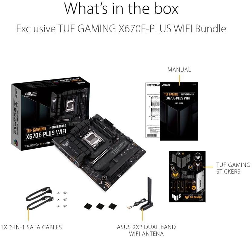 ASUS TUF Gaming X670E-PLUS Gaming Motherboard, ATX Form Factor, Socket AM5, Supports Dual Channel DDR5 Memory up to 192GB, PCIe 5.0 Support, 1x PCIe 5.0 x4 M.2 Slot, 2x PCIe 4.0 x4 M.2 Slots, 4x SATA 6Gb/s Ports, Wi-Fi 6E, Bluetooth v5.2, USB 3.2 Gen 2×2 Type-C Support, Windows 11/10 64-bit, Supports AMD Ryzen 7000 Series Desktop Processors