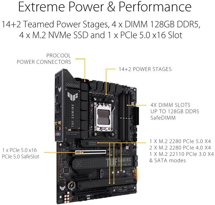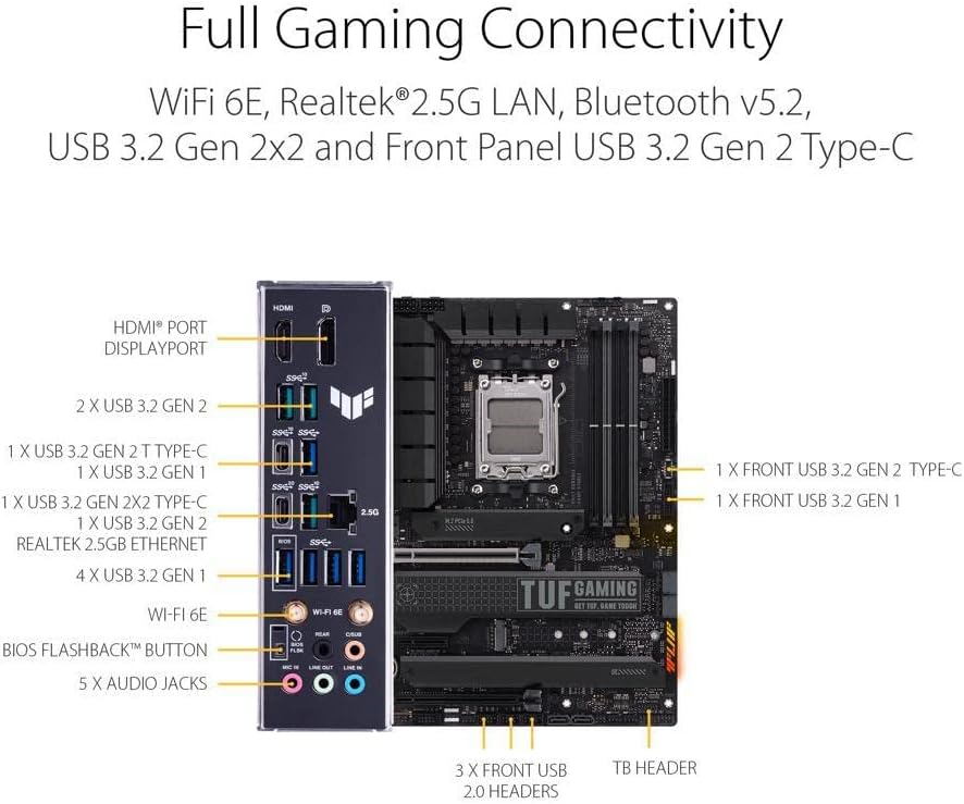 AMD AM5 Socket: Ready for AMD Ryzen 7000 Series Desktop ProcessorsUpgraded Power Solution: 14+2 teamed power stages, Eight-layer PCB, 8+8 ProCool sockets, alloy chokes, and durable capacitors for stable power deliveryNext-Gen Connectivity: PCIe 5.0, USB 3.2 Gen2x2 Type-C, Front USB 3.2 Gen 2 Type-C, Thunderbolt 4 header supportMade for Online Gaming: Realtek 2.5Gb Ethernet, WiFi 6E, and TUF LANGuardTwo-Way AI Noise Cancellation: Reduces background noise from the microphone and audio output for crystal-clear communication in games or video conferencesComprehensive Cooling: Enlarged VRM and PCH heatsinks, M.2 heatsinks, hybrid fan headers, and Fan Xpert 4 Utility in Armoury CrateAura Sync RGB Effects: Lighting design with intuitive touch controls of elegant edge, addressable RGB headers and RGB strip header support.