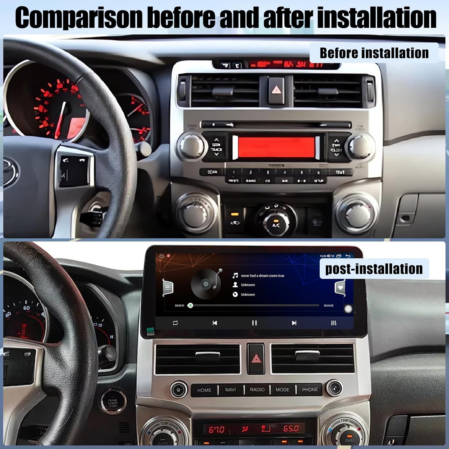 Automobile audio for Toyota 4Runner 2010-2019. All our replacement screens are open 1: 1 by engineers against the original car car. It is a perfect combination for the original panel. As soon as the original central console is removed and this car stereo is replaced, your car will be new. This machine can work directly to the original car cables, and the original functions can be implemented perfectly in this automobile stereo.