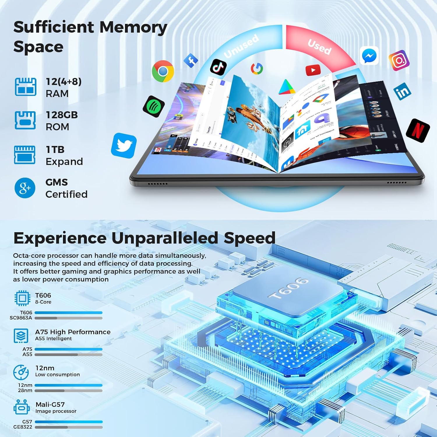 【Android 14 Tablet & Octa-core Processor】Powered by Android 14 OS, this tablet is upgraded in device customization, privacy permissions, data protection, and accessibility. T606 Octa-core CPU delivers excellent performance for smoother multitasking.