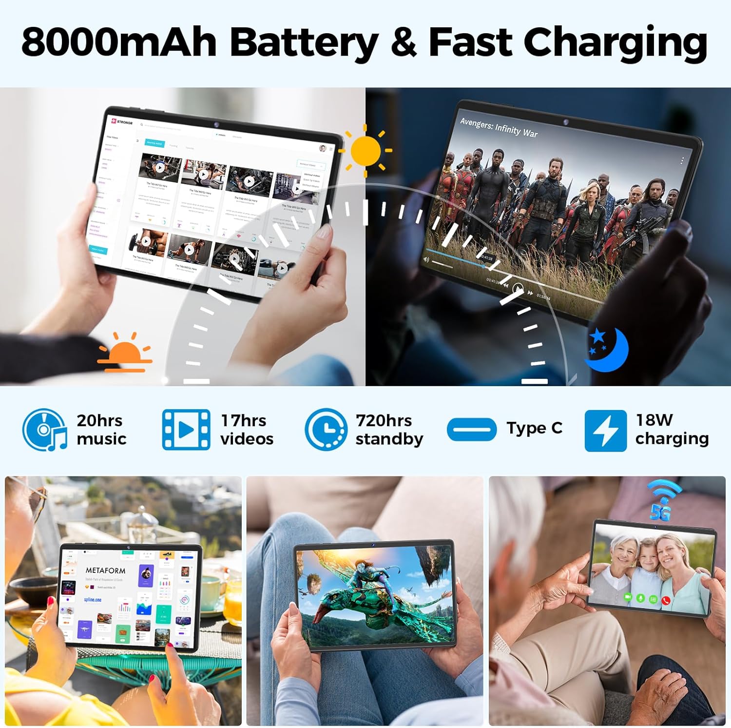 【Fast Connection & Adjustable Case】The tablet supports 2.4G/5G dual-band WiFi, allowing you to use a faster network. Bluetooth V5.0 connects quickly and has low power consumption. Meanwhile, the Android tablet comes with an adjustable case and a 3.5mm jack.