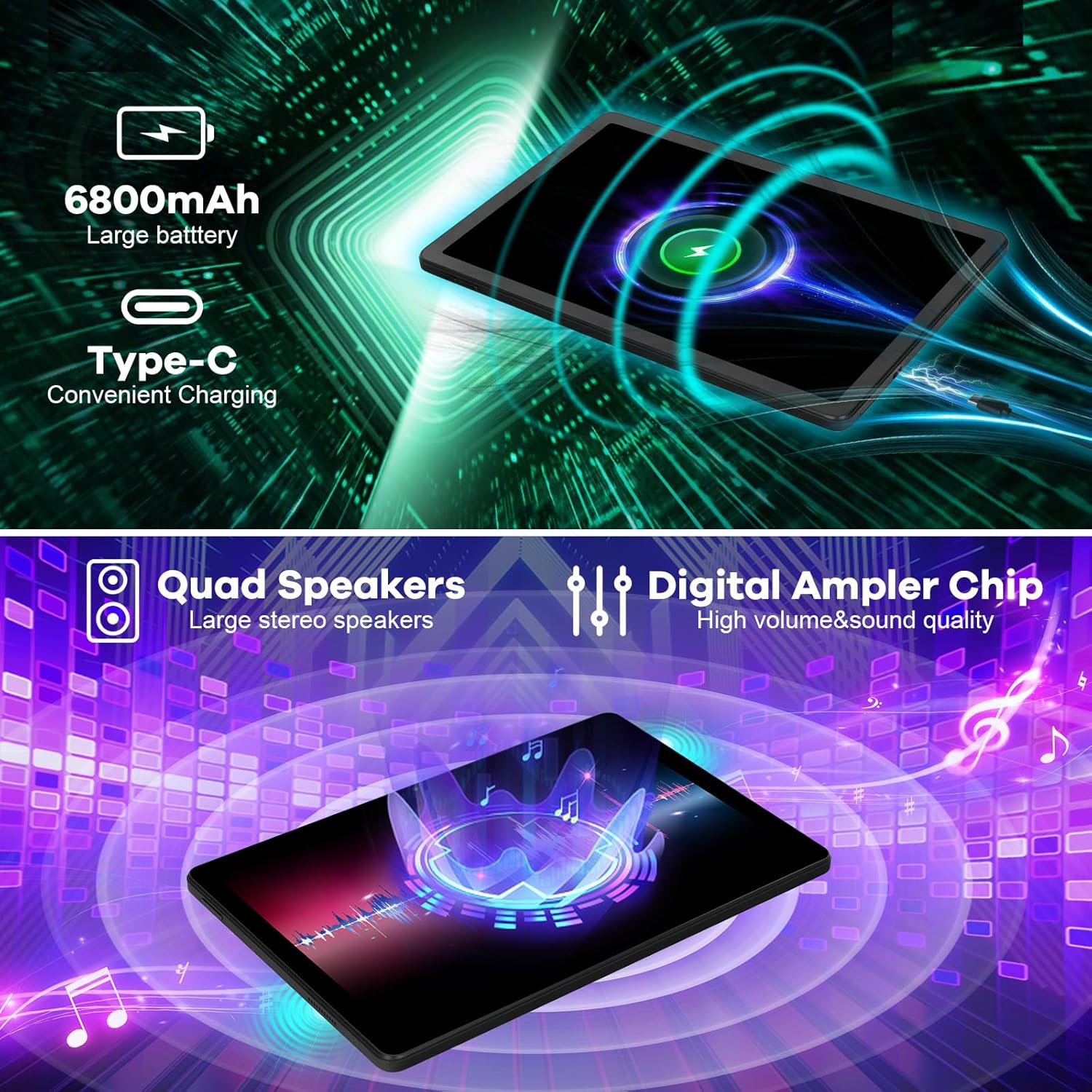 【6800 mAh Large Capacity Battery】The Android tablet with 6800 mAh large capacity battery, with long standby time providing longer reading and browsing time. allowing you to take it anywhere and anytime. And the USB-C port supports audio and data transfer.