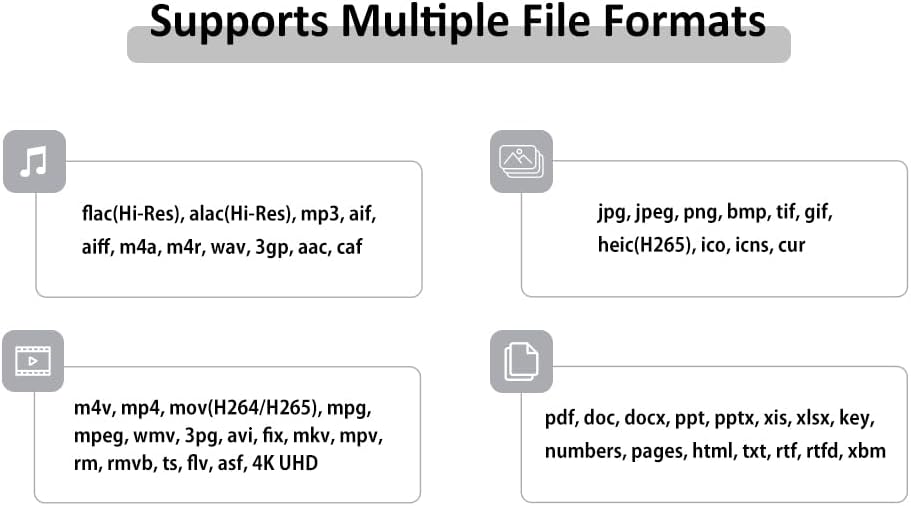 [Hi-Res Audio Playback for Music Enthusiasts] -This iPhone flash unit supports high -resolution audio formats such as Flac, APA and WAV, which provides superior audio quality. With compatibility in formats such as MP3, AAC, AIF and M4A, it is the best memory stick for iPhone users who want to enjoy high quality music on the march. Use this iphone USB storage flash unit for perfect music playback.