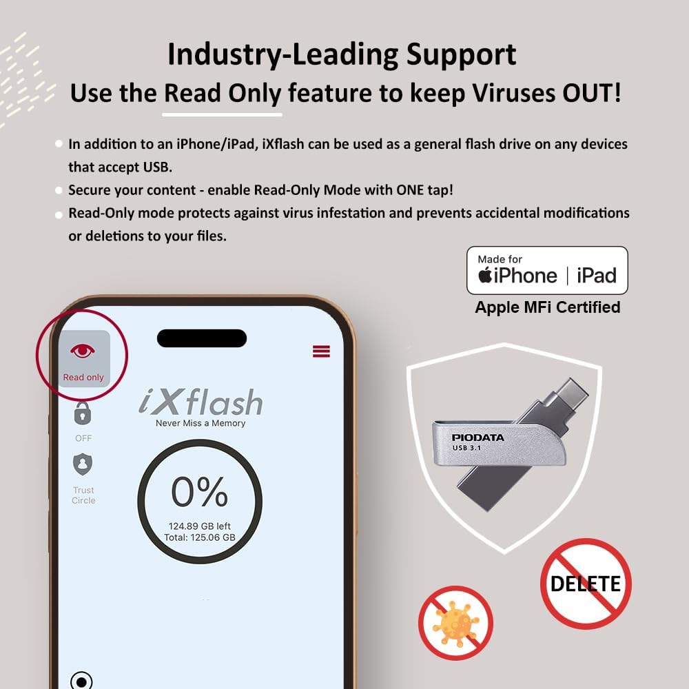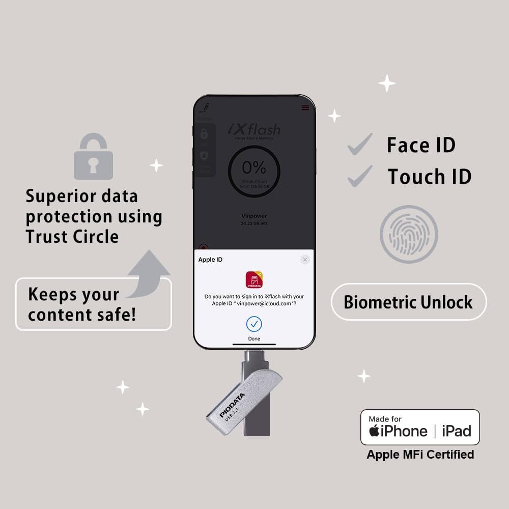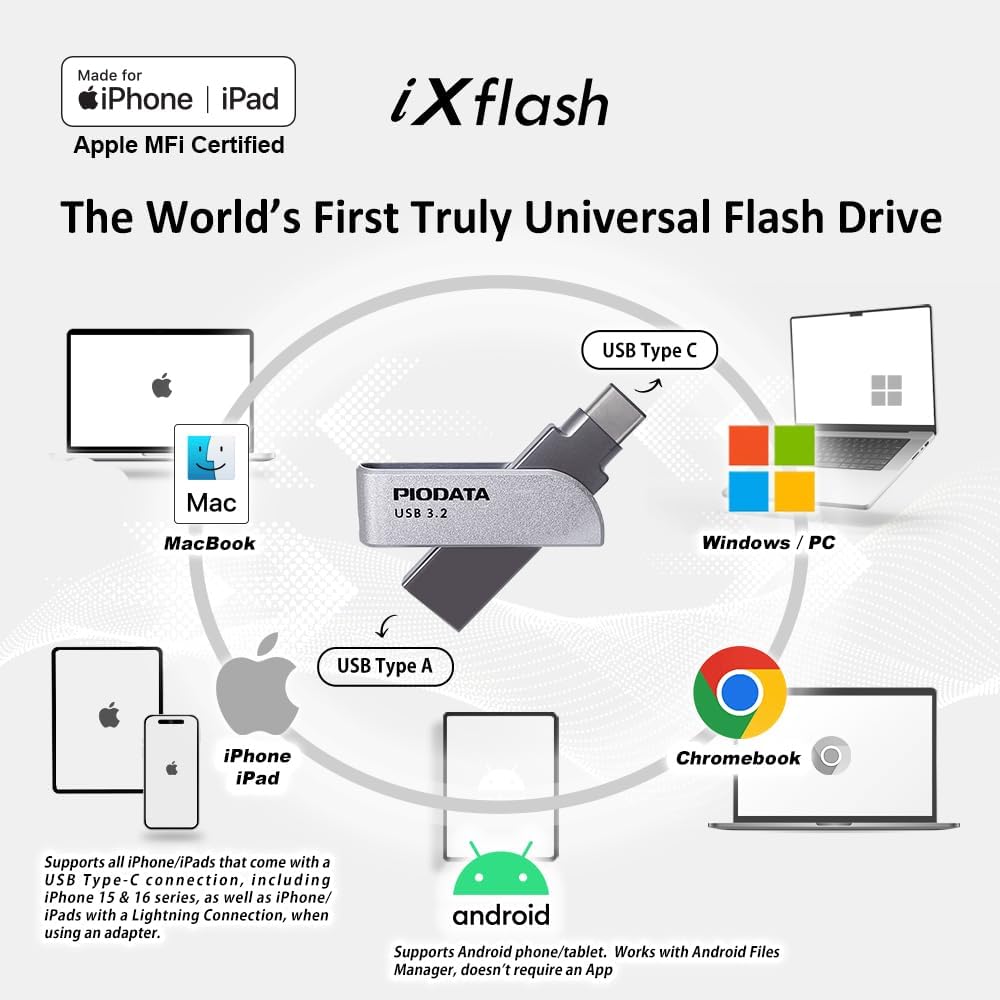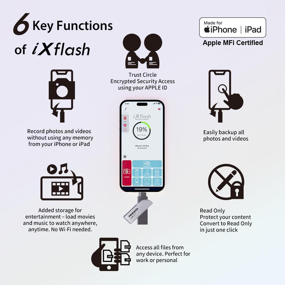 The ixflash piodata is a USB 3.2 GEN1 Flash unit of 256 GB, globally recognized as the First Flash and iPad Flash Unit of Apple MFI that does not use a Lightning connector. Designed with USB type A and USB type C connectors, IXFlash offers a versatile storage solution for a wide range of devices, including iPhones, iPads and computers. Whether you want to make a backup or transfer photos, videos or other important files, this Flash unit is the perfect tool. With support for high -resolution audio formats such as FLAC and high -definition video formats such as 4K, the IXFlash is an excellent option for users who love their highest quality media. In addition to media storage, it allows you to make a backup, restore and transfer files between devices easily. You can even record photos and videos directly to the Flash unit, releasing the internal storage of your iPhone or iPad. The IXFlash goes beyond basic storage with advanced file management functions, such as creating password protected zip files and is designed to function without problems with most protective telephone covers. It offers a true storage capacity and incorporates first level safety features, such as Key-Lock of Trust Circle AES 256 and reading protection and reading protection, ensuring that your data is safe from unauthorized access or accidental handling. Whether you are looking for a reliable photo for iPhone, an external external storage device for iPhone photo or a convenient USB flash unit to manage files on the devices, IXFlash piodata offers the perfect combination of performance, safety and ease of use. With the double layer protection through the circle of trust, only authorized users can be verified through Apple ID passwords, face ID or fingerprint id and access the content of the unit. The reading mode adds another protection layer when preventing viruses and maintaining files safe from handling. The Ixflash follows Apple's iOS protocol and is able to work with the most recent iOS and the 2 previous versions. Any iOS prior to that may not be compatible unless the iPhone or iPad updates to a compatible version of iOS. The IXFlash cannot store or reproduce video content downloaded in the application from the transmission services. This content is owned and can only be stored and seen through the application of that transmission service.