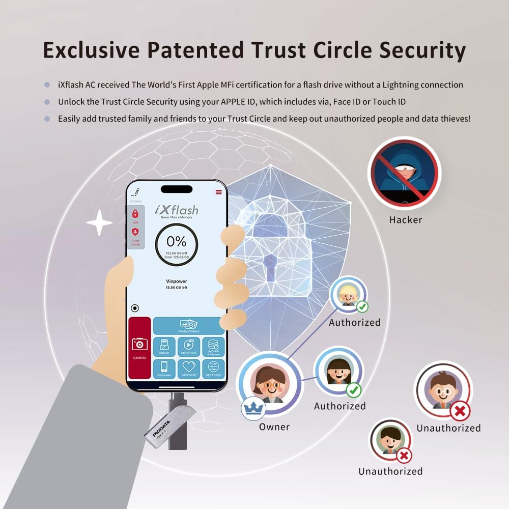 [Top-Notch Security with Trust Circle and Read-Only Mode] -With the patented security system of the Trust Circle of the Trust AES 256, the IXFlash restricts access only to authorized users. Unauthorized people cannot see or interact with the data on the device, safeguarding their privacy. In addition, the reading mode avoids modifications or deletions of accidental files and protects its potential virus devices, which makes this a safe storage solution for iPhones, iPads and computers.