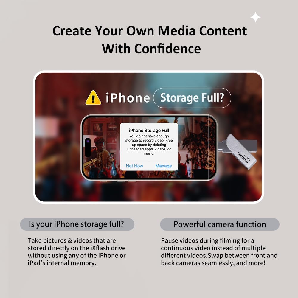 [Capture Photos and Videos Directly to the Flash Drive] – Release the space on your iPhone recording photos and videos directly to the Ixflash. This feature is ideal for those looking for additional phones for iPhone without worrying about maximizing internal storage. Use it as a iPhone storage flash unit for photos and videos, which makes it a perfect solution for photographers and cameramen.