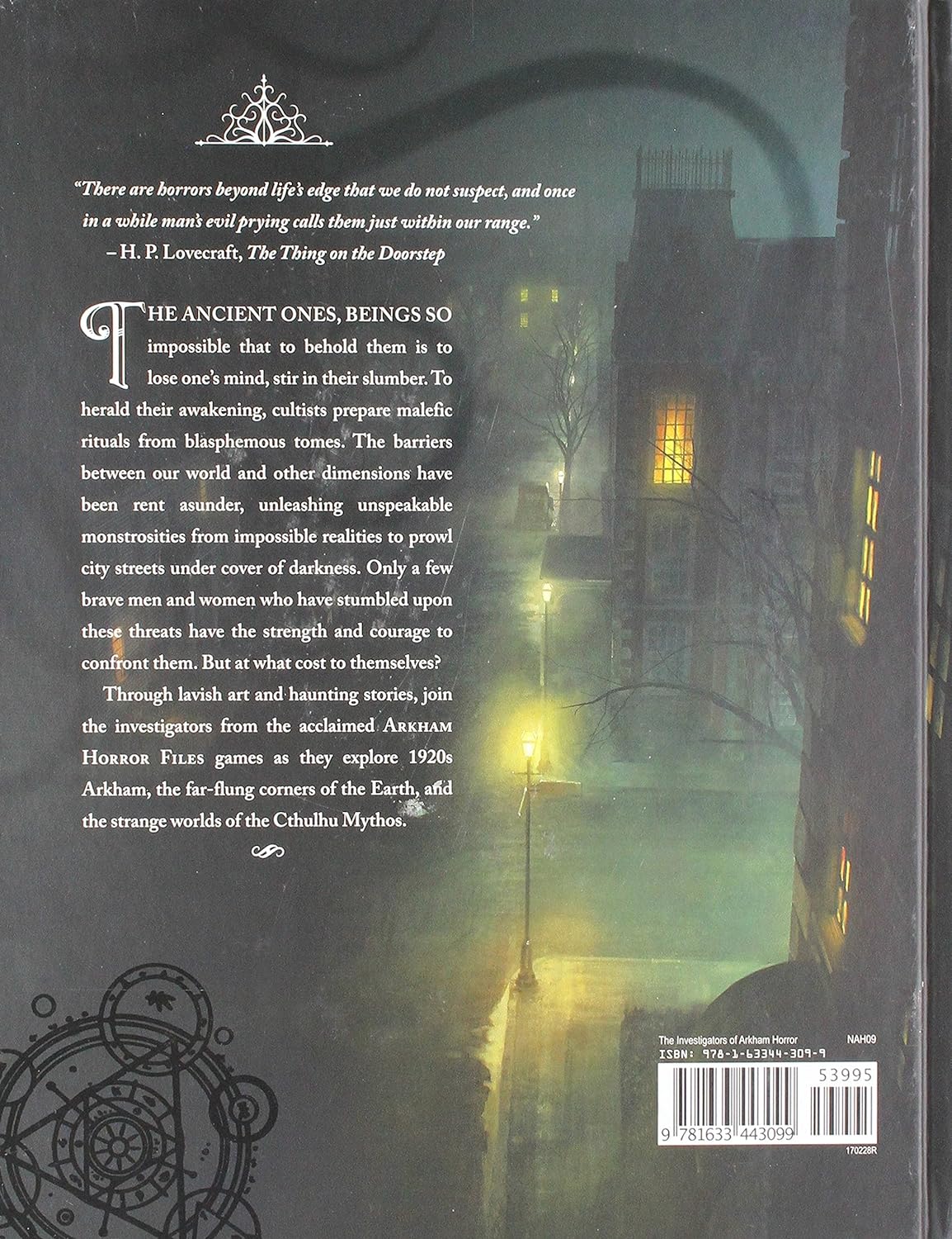 “We will see what dogs howl at in the dark and what cats strain their ears for after midnight. We will see these things and other things that no breathing creature has yet seen. We will leap across time, space and dimensions, and without bodily movement scrutinize to the depths of creation.” –HP Lovecraft, From Beyond A must-have tome for all the most daring fans of Arkham Horror, Eldritch Horror, Elder Sign, Mansions of Madness, and the other Arkham Horror Files games, The Investigators of Arkham Horror contains fifty-two short stories with explanations complete. -Color illustrations by more than forty of the most talented artists in the industry. Discover the hidden secrets of the researchers who risk everything to save humanity from certain doom! With its lavish art and haunting stories, this gorgeous 264-page hardcover art and setting book delves into the lives of the investigators of the acclaimed Arkham Horror Files games. These men and women explore those parts of our reality that lie outside what our senses and science can perceive, often confronting beings of such unfathomable power that simply contemplating them can shatter the mind. With The Arkham Horror Investigators, the stories of these heroic men and women take on a new focus as they explore 1920s Arkham, the remotest corners of the Earth, and the strange worlds of the Cthulhu Mythos.