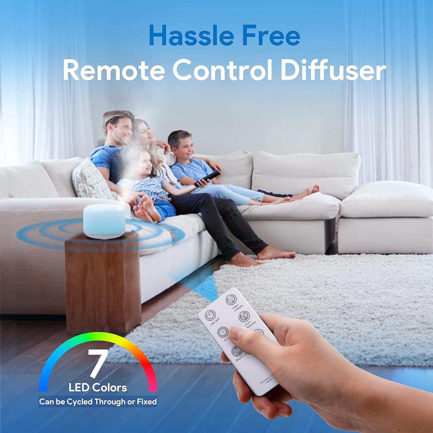 CONVENIENT REMOTE CONTROL: Our diffuser comes with an easy-to-use remote control that you can control it from up to 16.5 feet and change the lighting and misting modes as well as set the humidifier timer. The LED light can be fixed or toggled. The diffuser has 60/120/180 minute timers and constant on mode. You can also set the intermittent mist through the remote control.