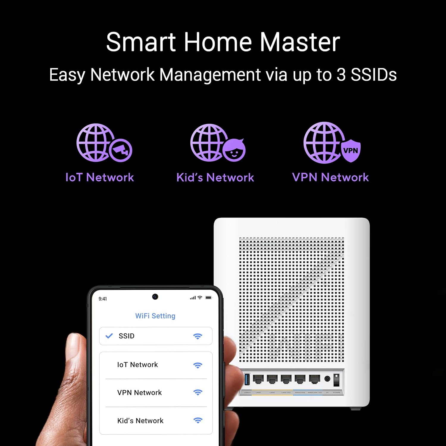 Easily set up to three SSIDs with Smart Home Master for easy IoT device setup and management, instant VPN connections, and convenient parental controls.