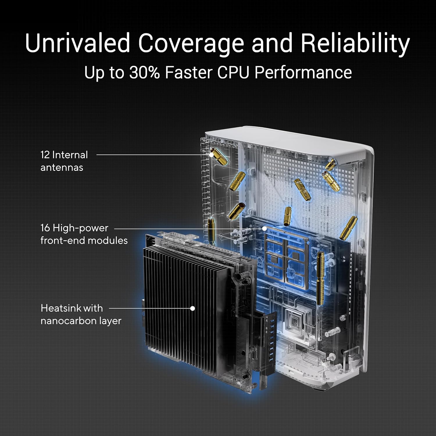The ASUS ZenWiFi BQ16 Pro raises the bar for mesh WiFi. Equipped with cutting-edge WiFi 7 networking technology, it offers unprecedented 16-stream connectivity, ultra-fast quad-band speeds of up to 30 Gbps, and optimized AiMesh. This quad-band mesh WiFi system is ready to future-proof your smart home network today.