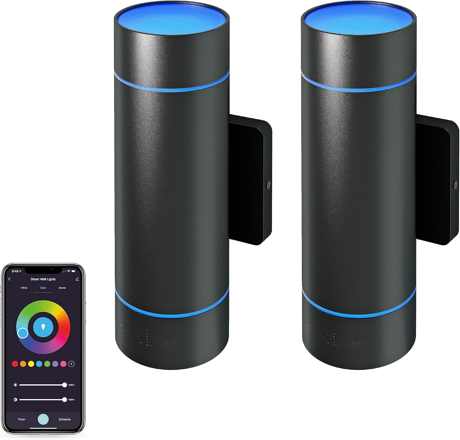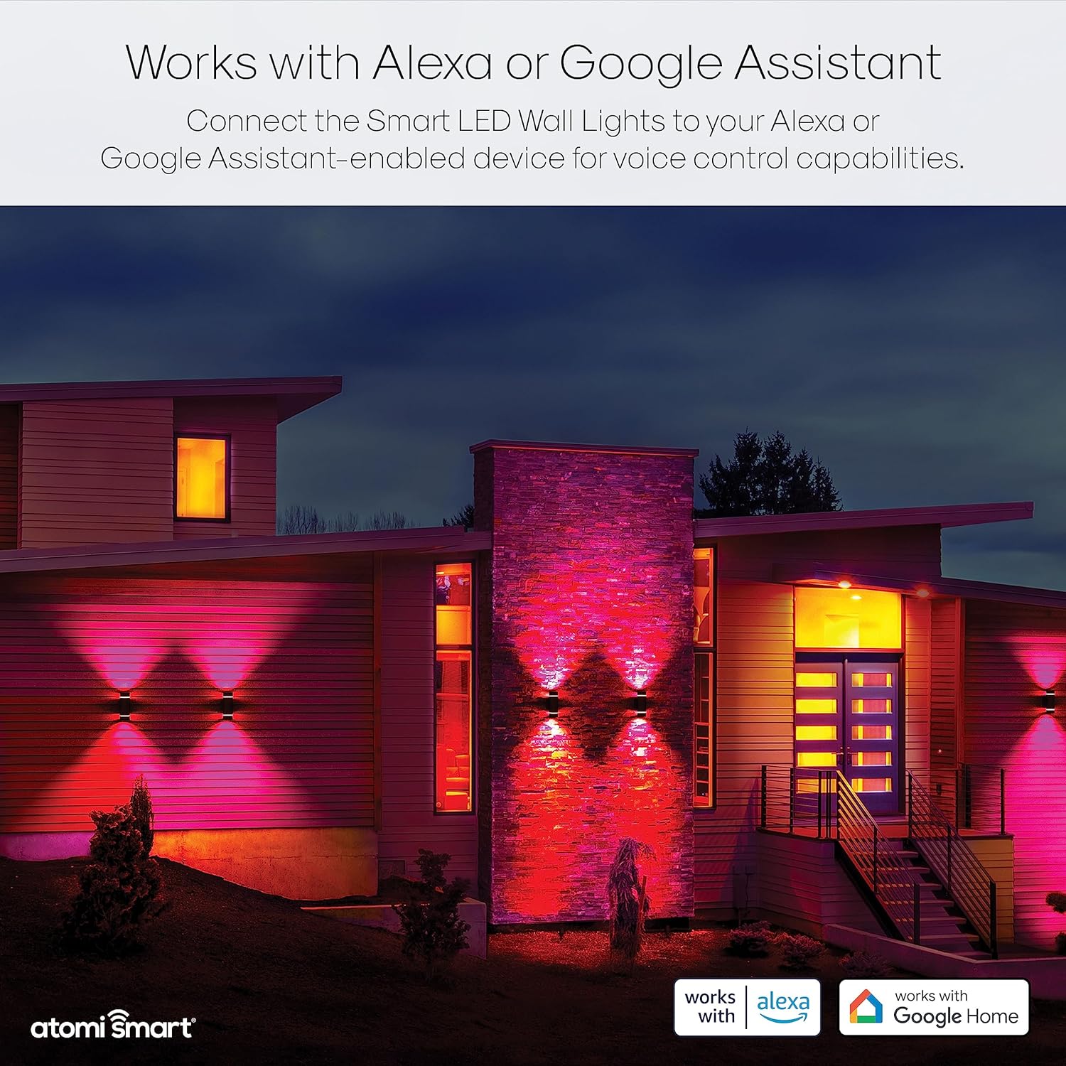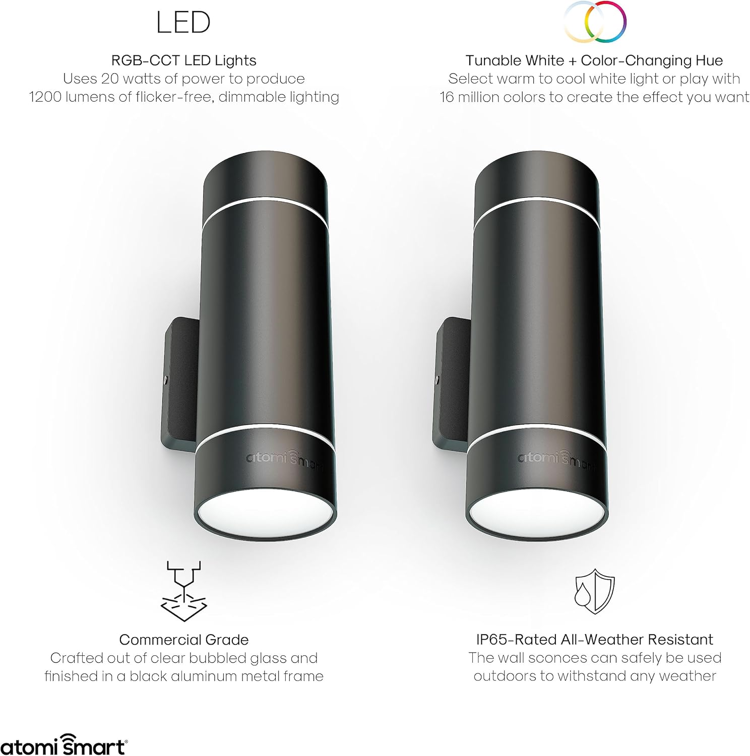 Atomi Smart WiFi Wall Lights instantly illuminate the exterior of your home for 50,000 hours with 1200 lumens of illumination. With over 16 million colors, adjustable white shades, and dimmable options, these high-tech wall lights illuminate your favorite outdoor spaces with incredible lighting features. Additionally, it can be operated from your smartphone using the free Atomi Smart app or with voice commands using Alexa/Google Assistant. Set schedules, change light color, adjust brightness and more using the Atomi Smart app to suit your needs. Made with an ultra-durable aluminum housing, a shatter-proof acrylic screen, and an IP65 rating to withstand any weather and protect against the elements.