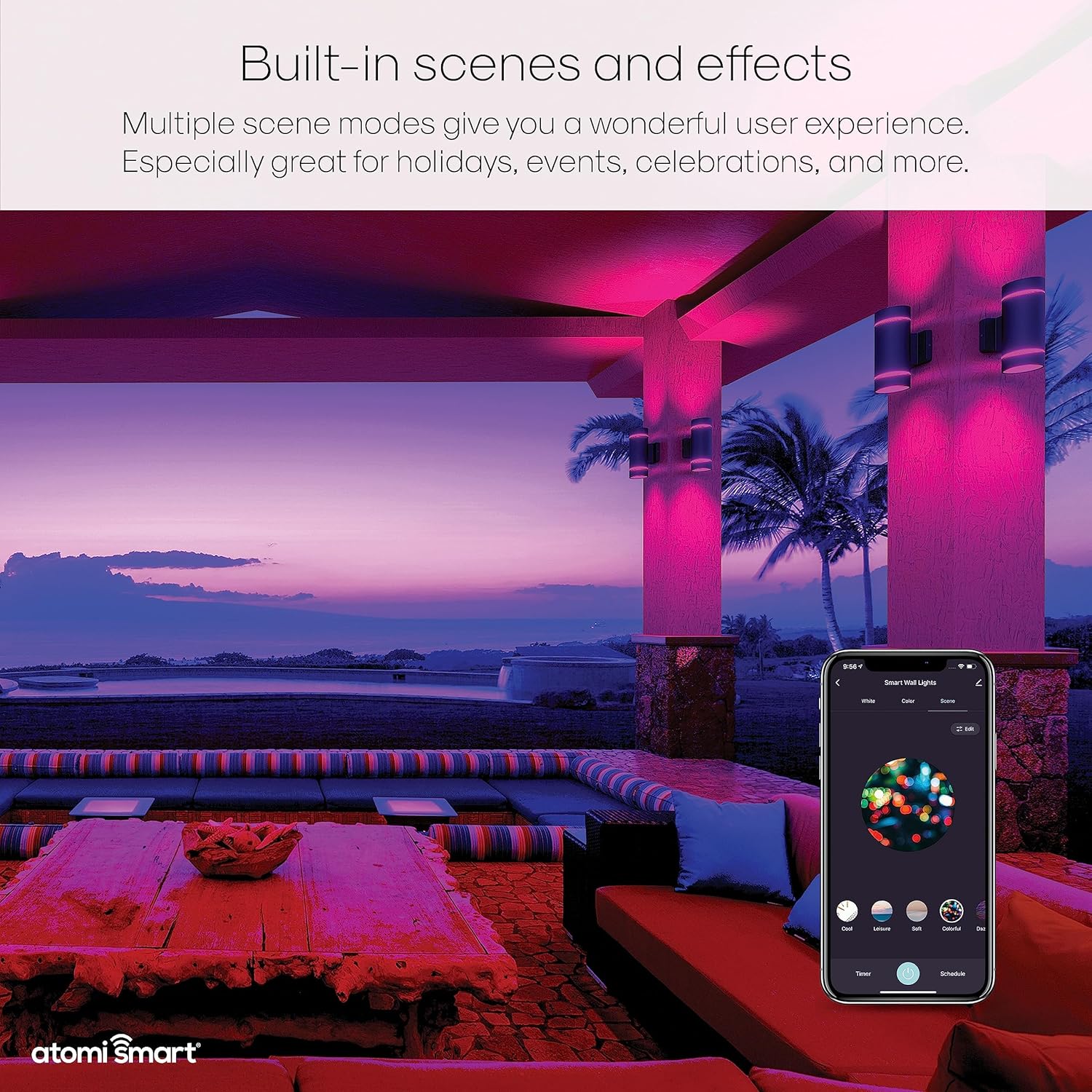 WIFI ENABLED: Turn lights on and off, choose and create color patterns, and set schedules right from your phone anytime, anywhere using the free Atomi Smart app.