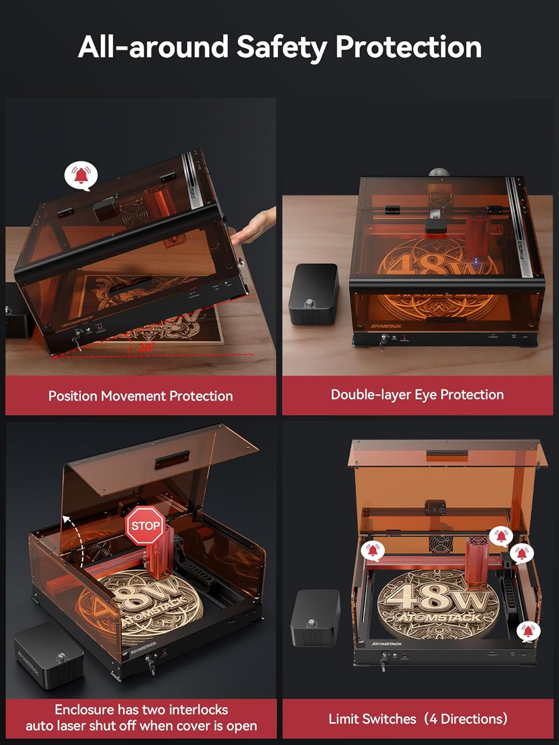 【Class 1 Safety Diode Laser Engraver】ATOMSTACK A48 Ultra is a Class 1 diode laser engraving machine designed for user safety. Equipped with safety lock, position motion detection, limit switches and 2-layer protection, it ensures safe use. Comes with a protective eye cover, you don’t need to buy an extra case or glasses anymore. With ATOMSTACK A48 Ultra, you can create DIY projects, make gifts and start your business even at home. (Class 1 laser, 48000mW output power)
