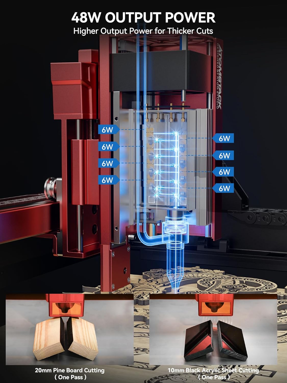 【One Key to Switch Engraving/Cutting Mode】ATOMSTACK A48 Ultra laser cutter adopts a brand-new laser design, which can switch between 24000mW and 48000mW output power by one physical key, and activate different modes for different engraving and cutting jobs, which can be used for both fine engraving and strong output.