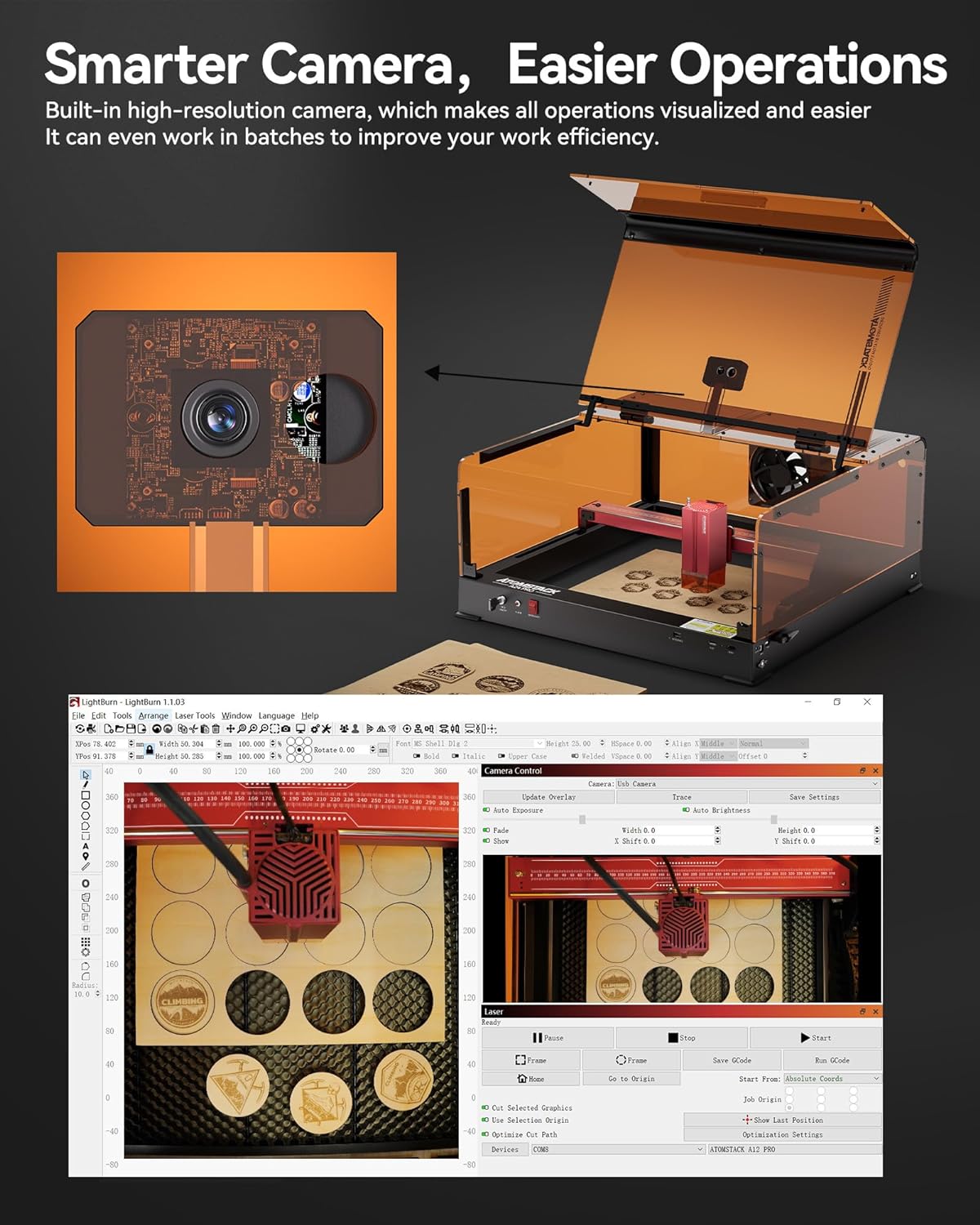 【Say Goodbye to Multiple Trials and Errors】ATOMSTACK A48 Ultra laser engraver for wood and metal has a built-in high-resolution camera that enables one-touch auto-focus and focusing in 8S, which is fast and accurate, making all operations and processes more visualized. ATOMSTACK 48000mW laser engraver can improve efficiency by working in batches for both engraving and cutting, which requires connection to PC software.