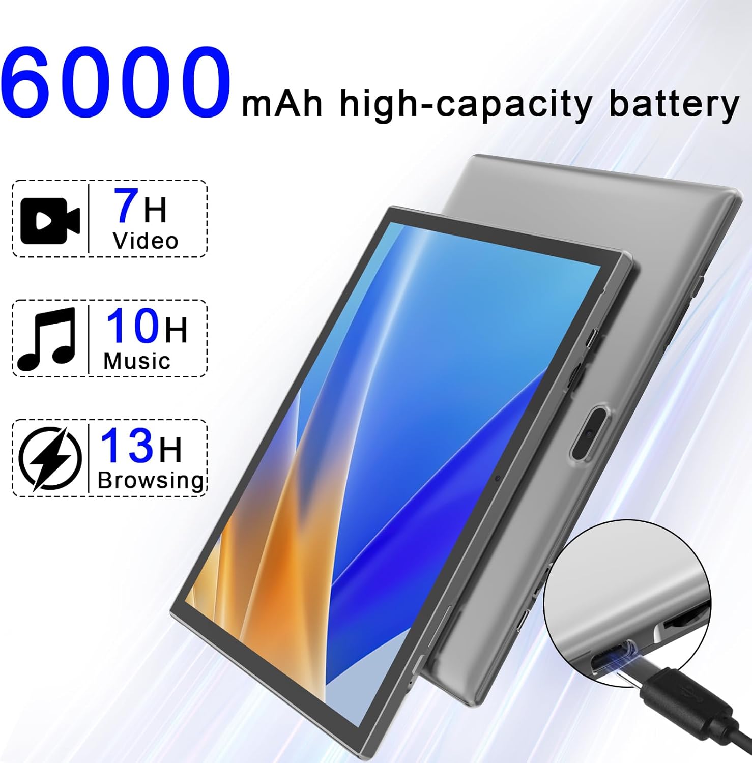 【Long Battery Life】6000mAh rechargeable battery and low-power CPU allow you to download lots of movies, e-books and music. The battery lasts up to 7-13 hours on a single charge, making it convenient for long flights, camping and road trips.