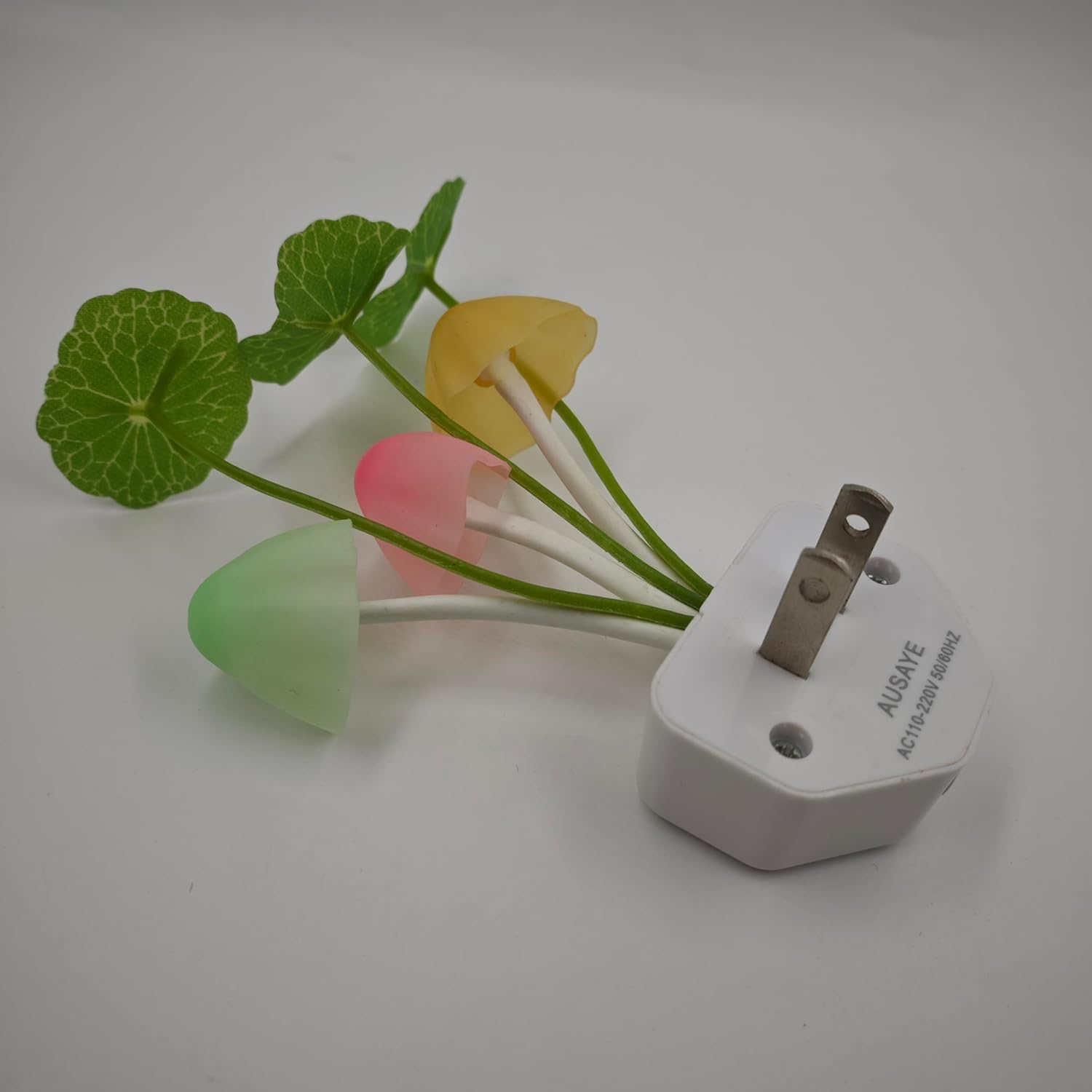 Features: Color: 2 warm white LEDs + 1 color changing LED, colorful and soft LED light, great for home decoration Leaf Material: Plastic Mushroom Material: Soft Silicone Smart Auto On/Off in Dark during the day, Long lifespan with energy efficiency Plug Type: US PlugsSpecification: Sensor Type: Light Sensor Input Voltage: AC110- 220V Operating Frequency: 50Hz-60HzPower consumption: 0.6W LED quantity: 6 (3 LED lights in each night light) Package includes: 2 packs of night lights. Avoid hitting obstacles in the dark, navigate easily, just get AUSAYE 0.6W LED night lights and place them in your house: hallway, bathroom, kitchen, living room. , Bedroom, Children's Room, Nursery, Staircase, Entryway and other places that need light in the dark. They will be of great help in night operations.
