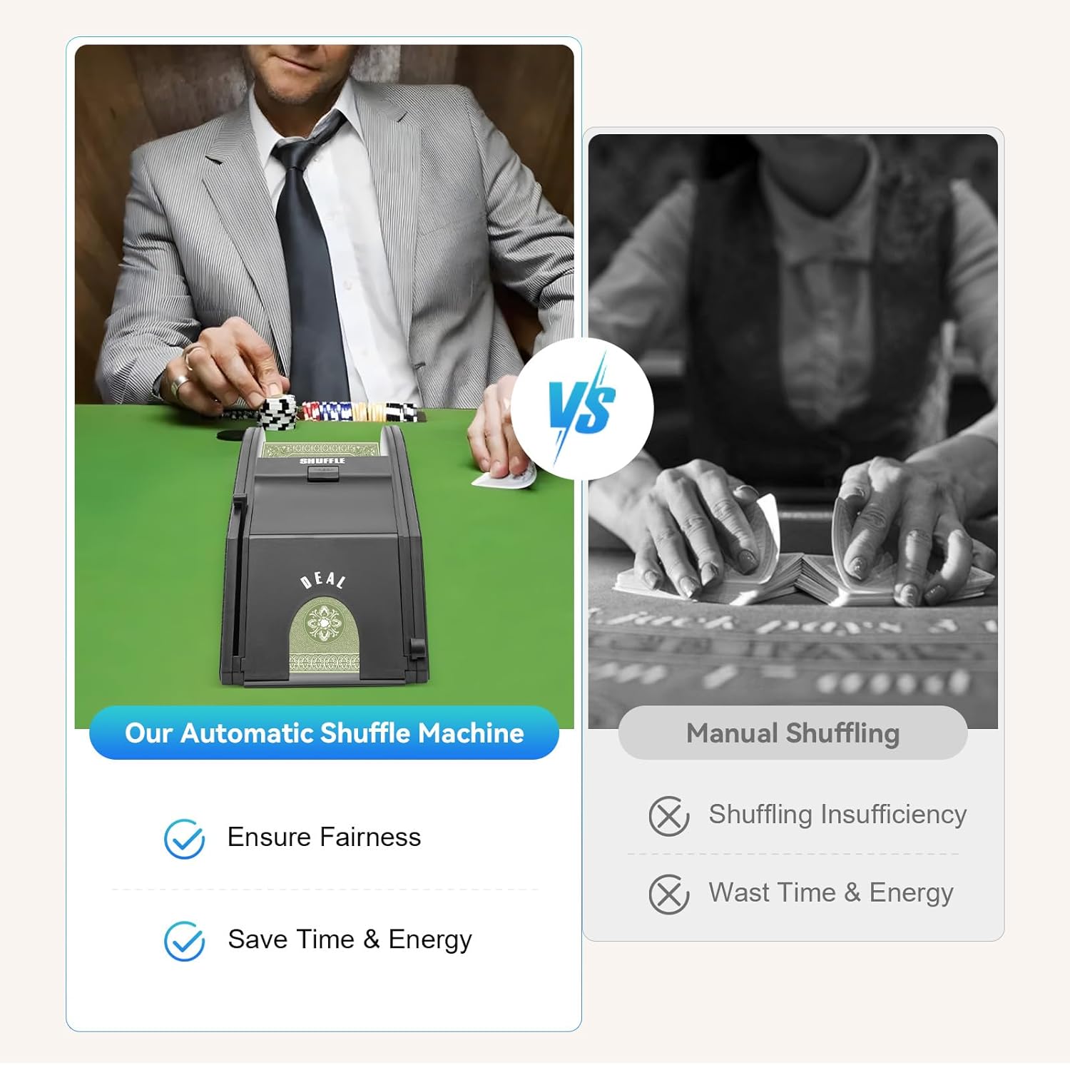 【Multiple application】 Our Shuffle Machine is very suitable for humans, poker, Texas, Poker, 21 points and card card cards. Most conventional size cards can be appropriate. It can contain up to 2 standard cards or bridges.