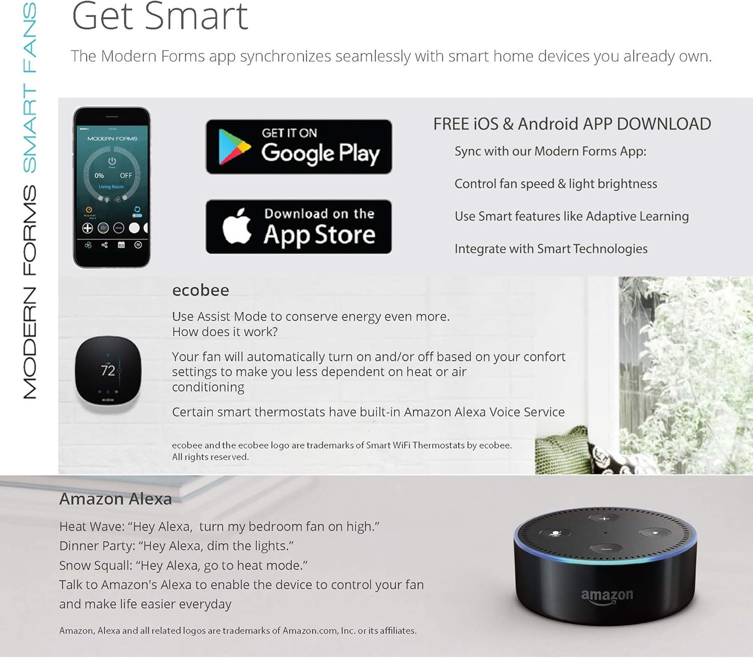 All Modern Forms Smart Fans can be controlled with the Smart Home Tech you know and love: Alexa, Google Home, Samsung SmartThings, and Ecobee. Smart Home Integration is a cinch – simply download the Modern Forms App on your iOS or Android device and follow the integration steps.