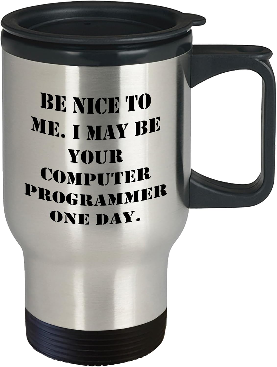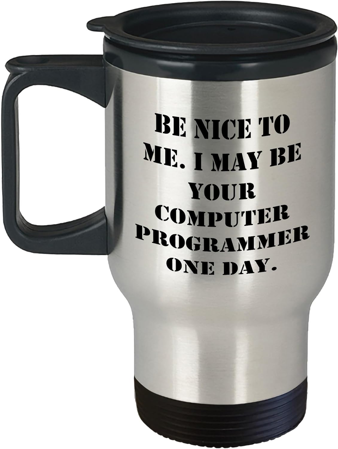 Grab this computer programmer travel mug if you are a computer programmer or know someone who is now or someone you hope can be a computer programmer in the future! Let people know how important coders are in our daily lives with this travel coffee mug with the funny quote “Be kind to me. Maybe one day I'll be your computer programmer.”