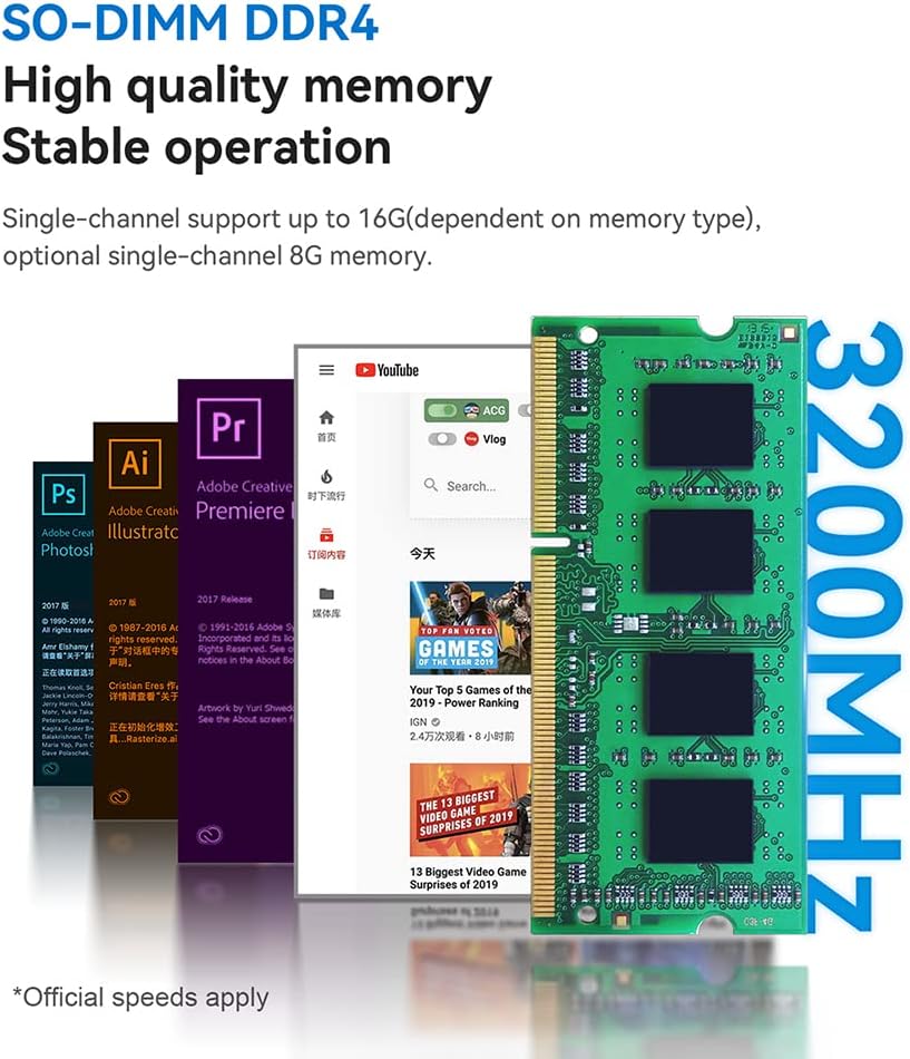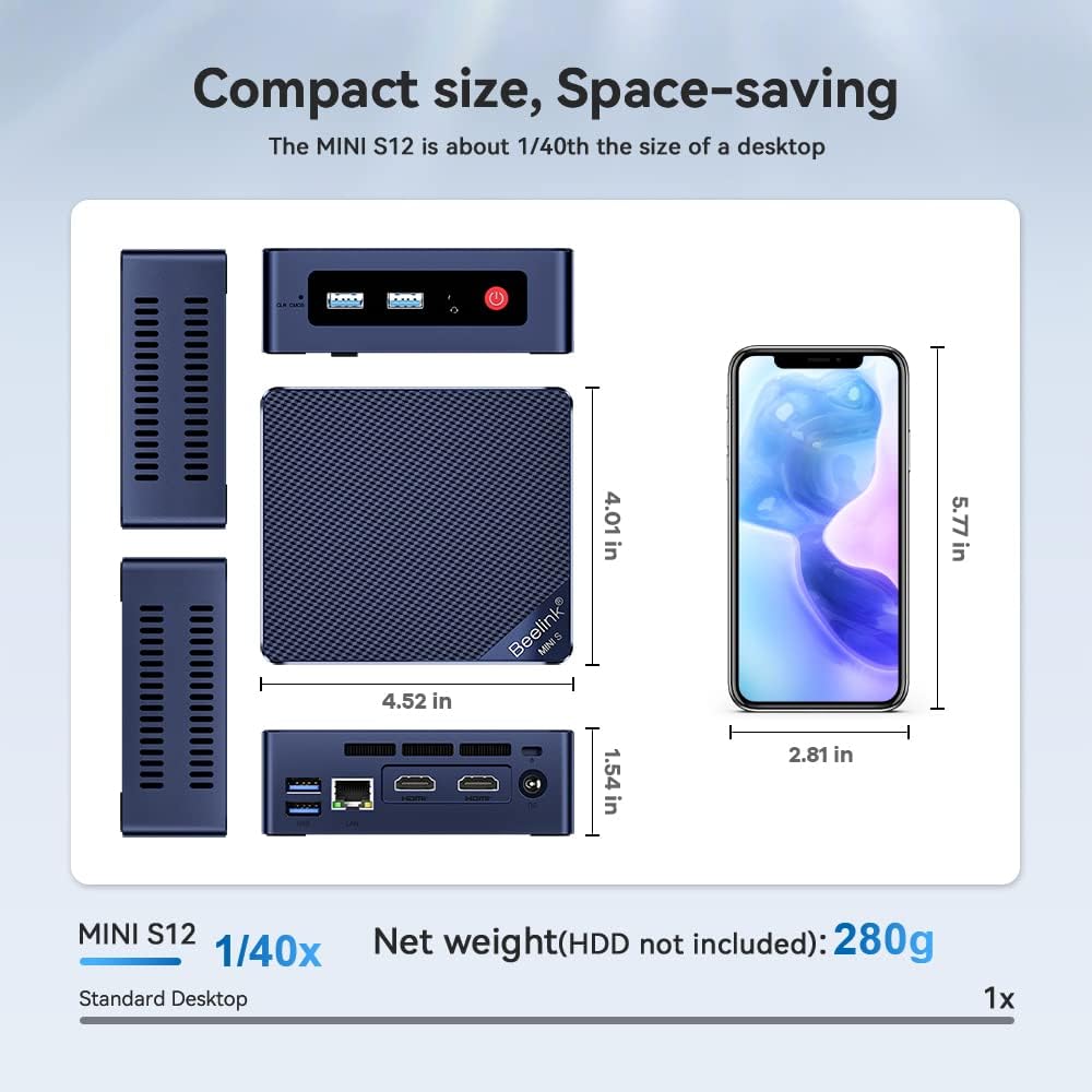 ✔️Powerful Performance: Beelink MINI S12 mini PC is powered by 12th Gen quad-core N95 (faster than 10th Gen J4125). The CPU lithography process is 10nm and its base operating frequency is up to 3.4GHz (4C/4T) and supports 6MB smart cache. The micro PC creates a smooth experience for your video streaming, home visual entertainment and light office, say goodbye to system crashes and buffering.