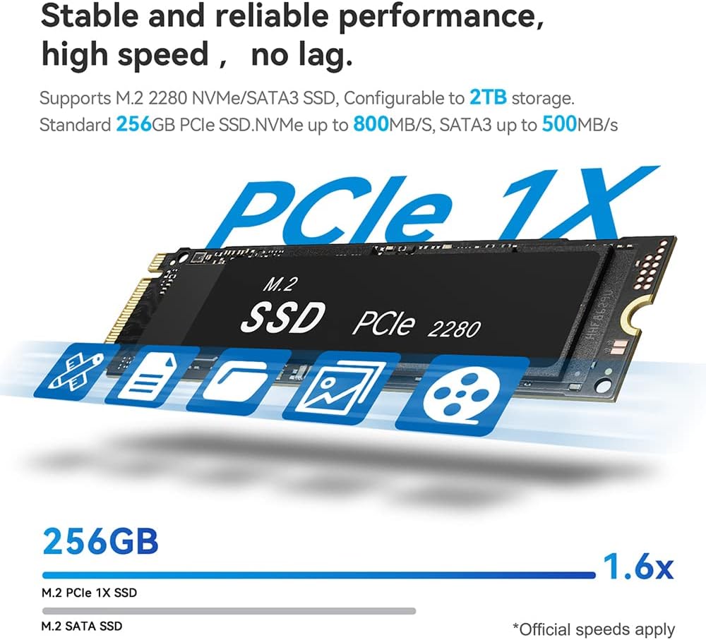 Expandable Storage: The mini computers have two internal connectors, one is M.2 2280 SSD, the other is 2.5 inch 7mm SATA HDD which supports up to 500GB~2TB expandable storage.