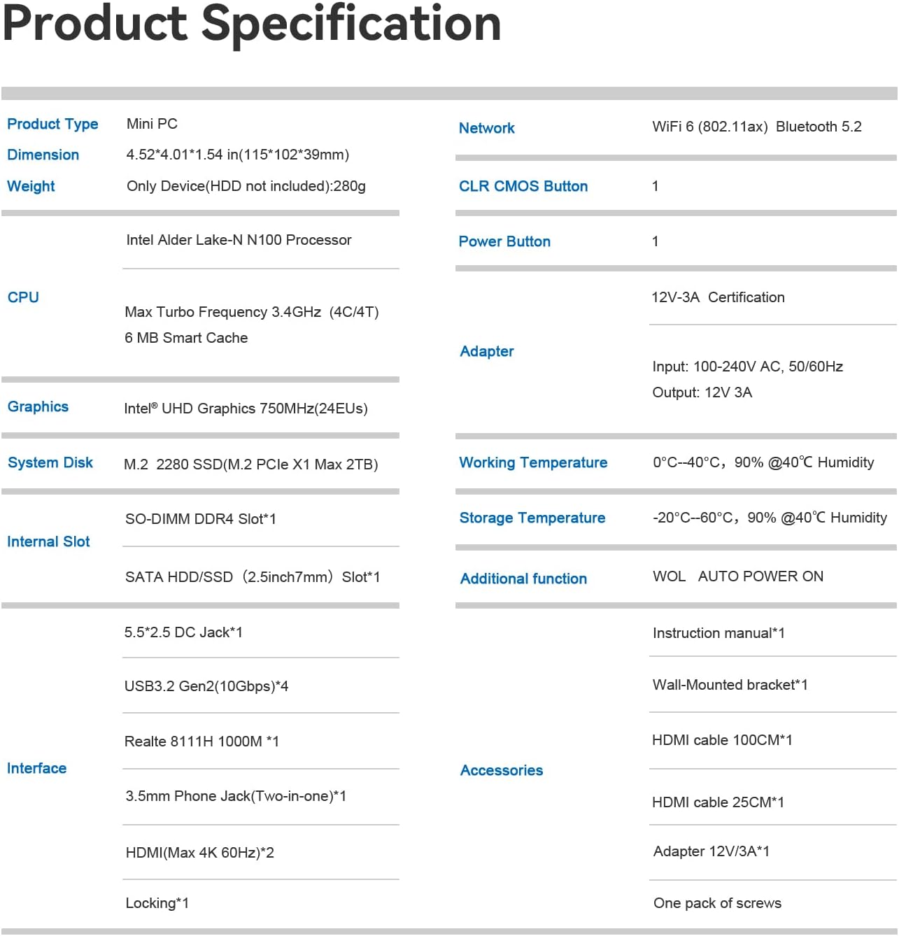 ✅【Dual 4K Display & Improved Cooling System】—The Intel UHD iGPU delivers powerful graphics performance and two HDMI 2.0 ports let you multitask efficiently on two 4K@60Hz displays. Also supports AV1 decoding. The Mini S12 Pro N100 has a large, silent CPU fan, a copper heatsink, and a dedicated SSD cooling shield. The updated cooling mechanism is much better than that of the N5095 mini PC.