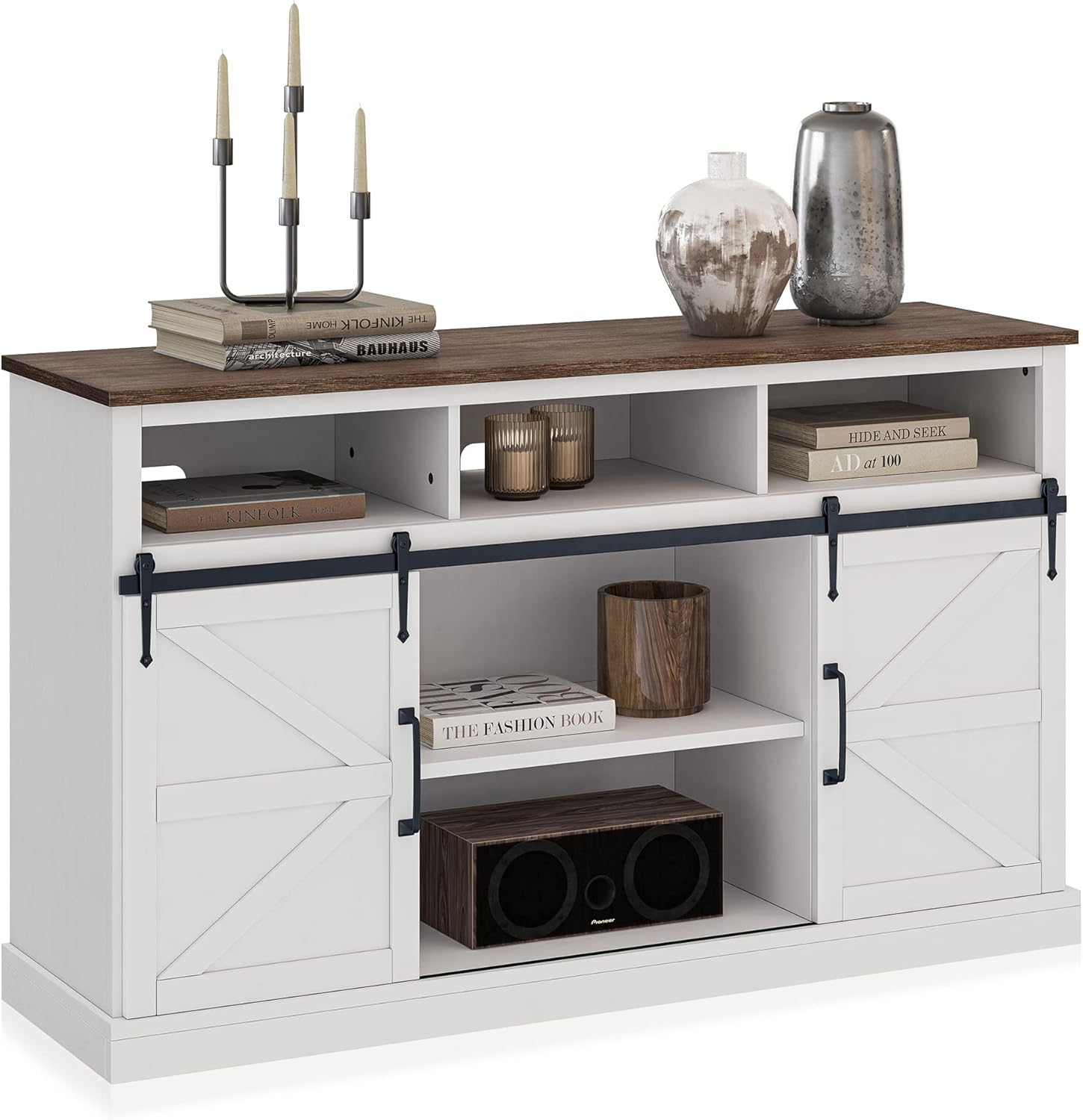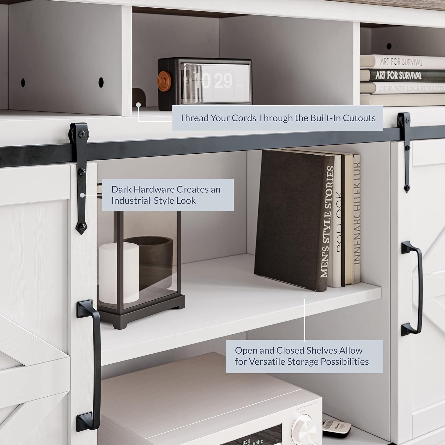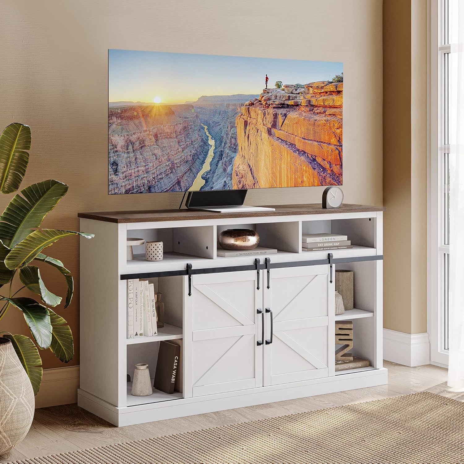 [FARMHOUSE WOOD TV STAND] This wood TV storage cabinet features sliding barn-style doors for a rustic farmhouse style, while the dual white and wood tone introduces a modern appeal that's perfect for a variety of decor styles.